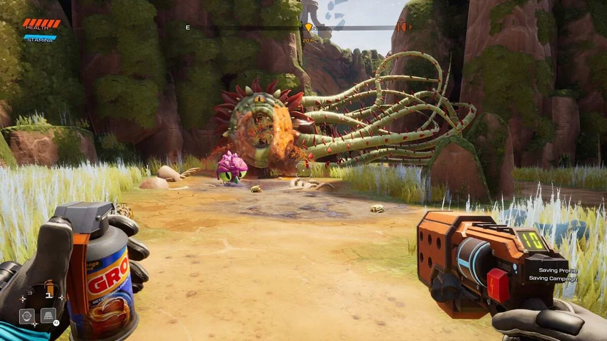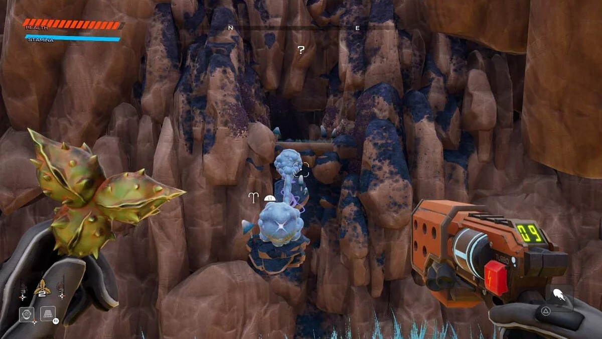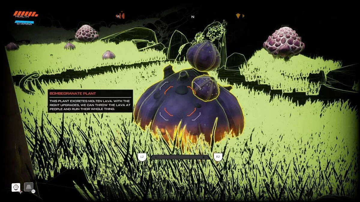 В Journey to the Savage Planet очень важен элемент исследования окружающего мира. Поэтому не стремитесь следовать по тропике задания, а сходите с нее, чтобы как можно лучше изучить игровые локации. Так вы сможете найти различные секреты и сюрпризы, которые приготовила для вас планета AR Y-26. Видите точку захвата в противоположном направлении? Изучите ее.