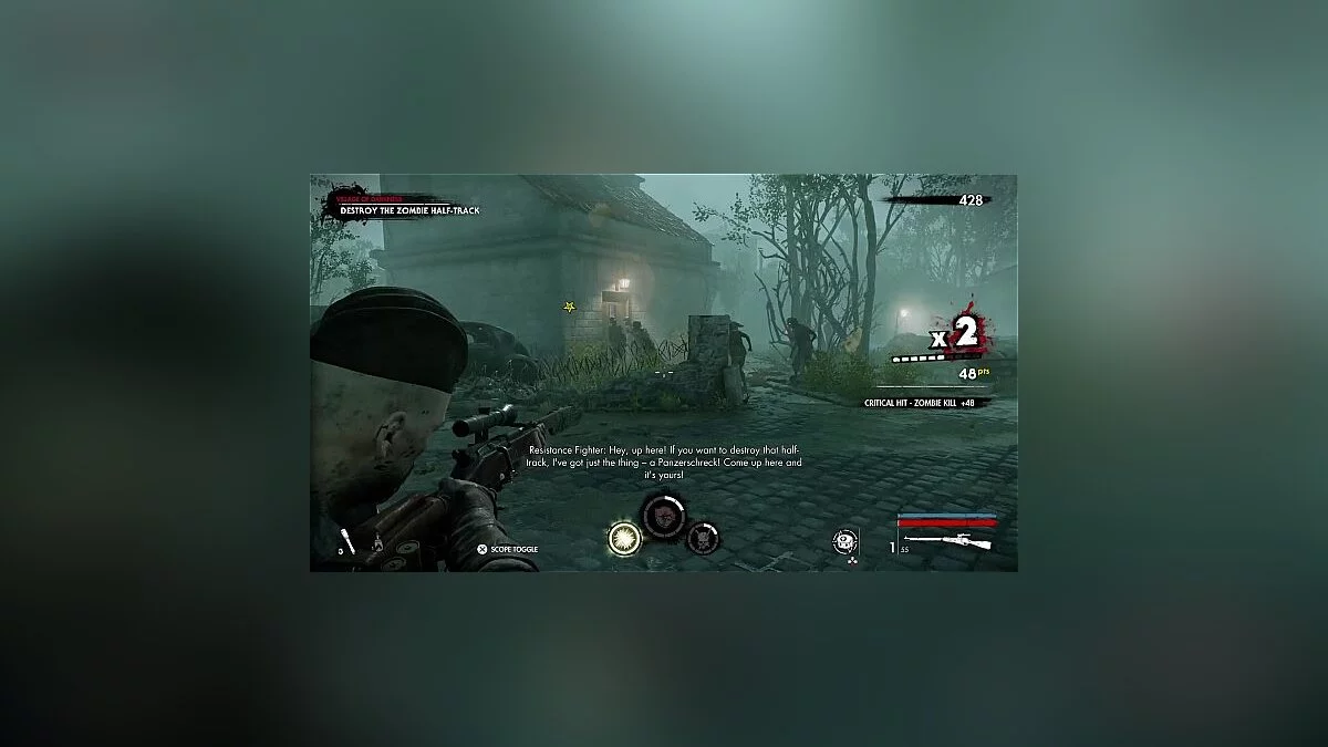 После выхода из подвала снова покажут небольшую вставку. На этот раз новым противником оказывается генерал смертников. Практически сразу вы услышите как вас зовет боец сопротивления. Он засел в башне и у него есть «Панцершрек».