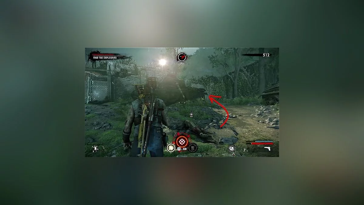 Теперь займитесь заданием. Найдите и принесите бомбу на место и подорвите ее. Следуйте в освободившийся проход. Спускайтесь вниз и бегите вправо по дороге, в самом конце которой есть небольшое здание с фонарем у входа. В комнате вы найдете комплект для улучшения оружия.