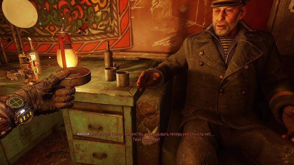 - В убежище, где нужно будет вправить кэпу ногу, поделитесь с ним консервами.