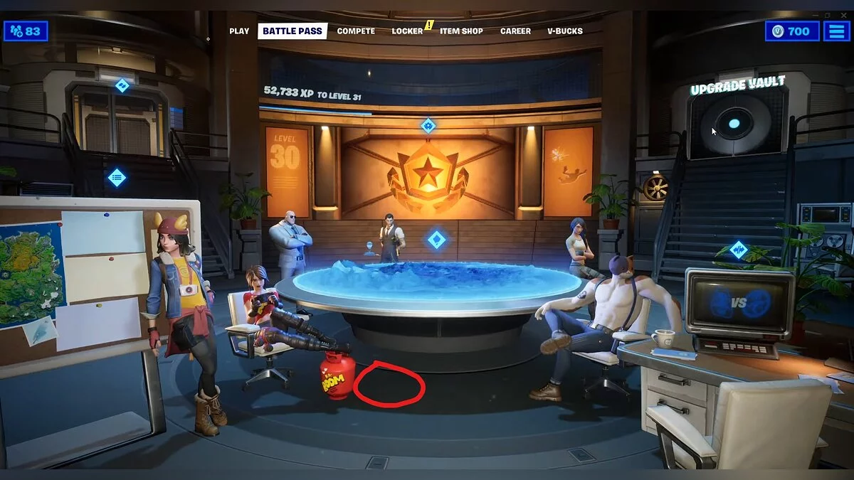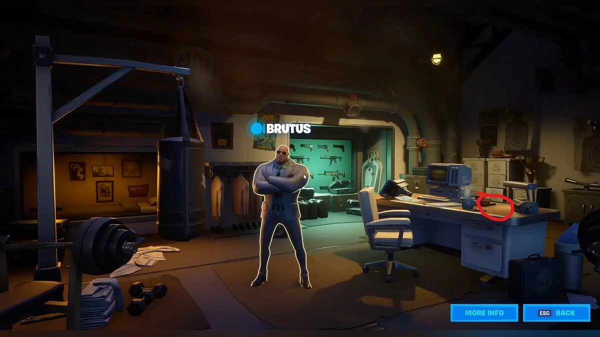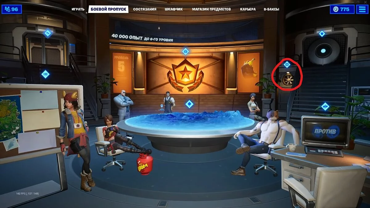 Теперь вам предстоит найти три чимичанги, разбросанных по всему штабу. Нажмите на «Боевой пропуск». Первая чимичанга будет лежать под столом рядом с красным цилиндром.