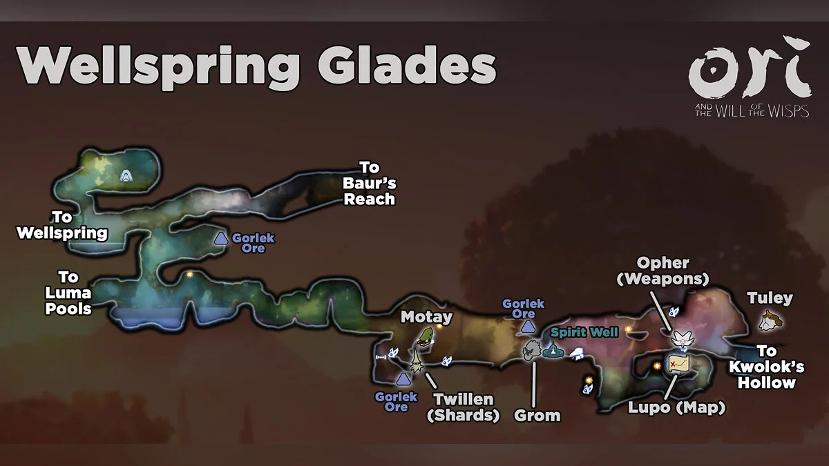 Карта Ori and the Will of the Wisps, на которой можно найти Горликову руду (Gorlek ore), Каменные ключи (Keystone) и различных персонажей на локации Родниковые поля (Wellspring Glades).