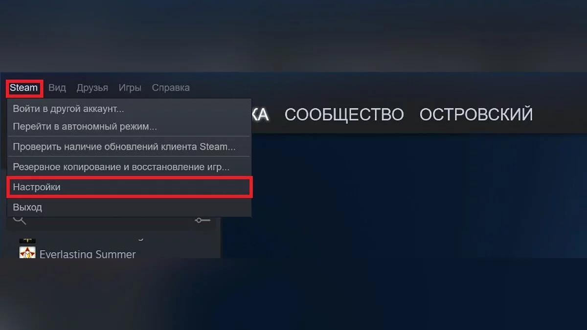 - Нажимаем на верхней панели на пункт меню «Steam»;
