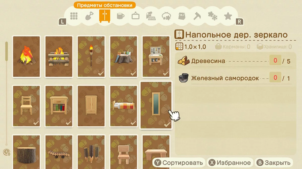 Если вы хотите изменить любой из внешних признаков персонажа уже после начала игры, то вам достаточно иметь специальную мебель — трюмо, комод, зеркало, туалетный столик и так далее. На первых порах ее у вас, конечно, не будет, но рано или поздно вы сможете ее создать с помощью рецепта для крафта или купить в лавке Нука (Nook's Cranny).