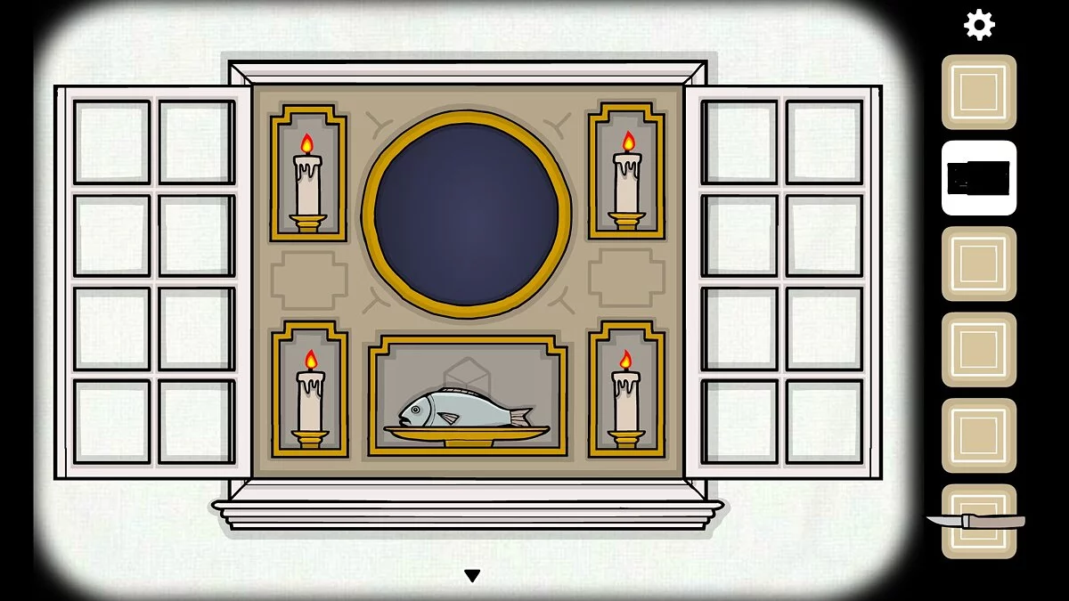 7. Разместите свечи на постаментах и зажгите их. Рыбу положите на блюдо посередине. Кликните на отверстие в стене, а затем и на белом кубе.