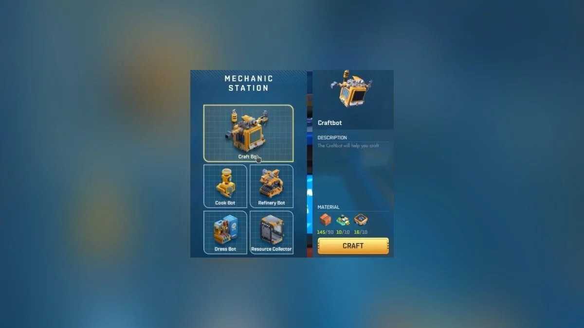 Польза от ботов очевидна. Например, если поставить рядом бота-переработчика (Refinery Bot) и собиратель ресурсов (Resource Collector), можно быстро набрать деревянных блоков. В первую очередь стоит позаботиться о создании бота-ремесленника (Craft Bot). Он покажет предметы, которые можно создать и какие ингредиенты для этого потребуются.