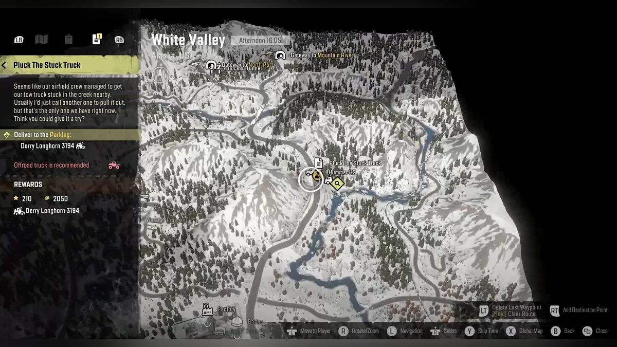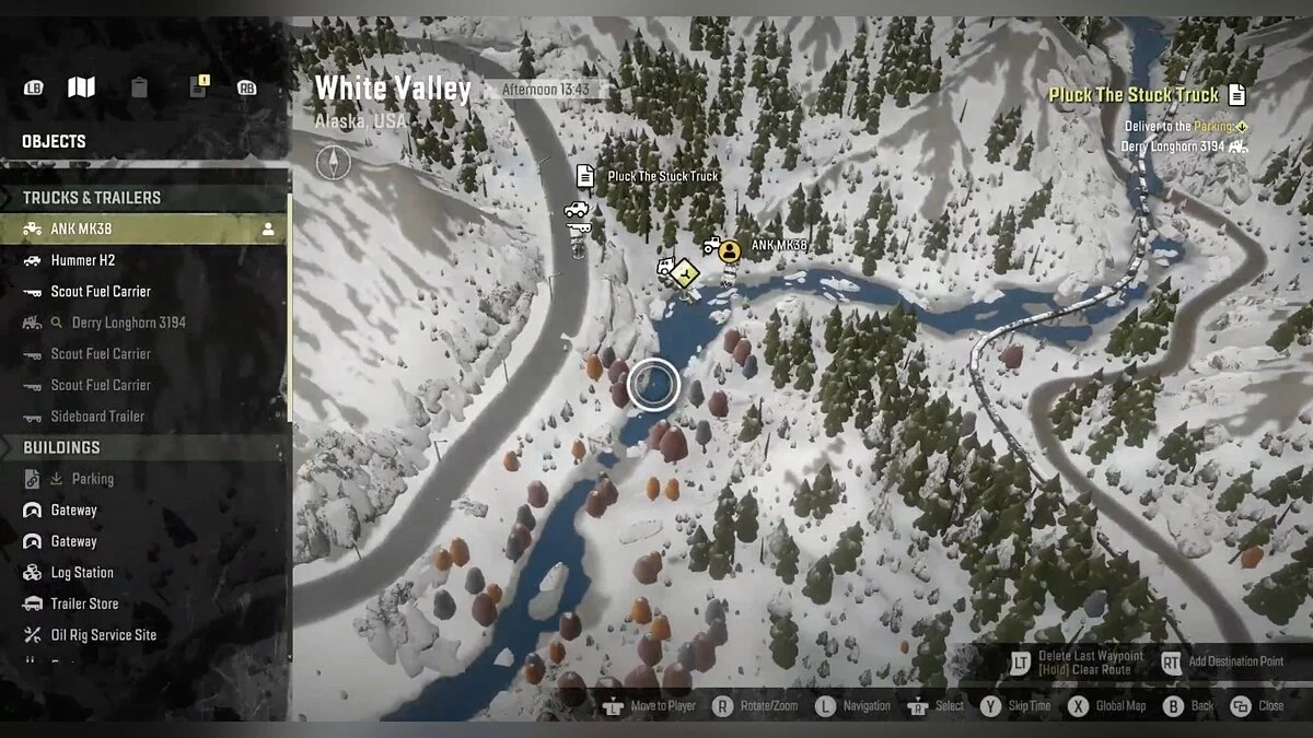Этот мощный тягач застрял один-одинешенек на Аляске. Как только вы окажетесь в локации «Белая долина», переместитесь в северо-восточный угол карты. Проезжая по шоссе, ведущему к развилке и точкам перехода в «Северный порт» и «Горную реку», вы можете увидеть, как на одном из участков к дороге совсем близко подходит река.