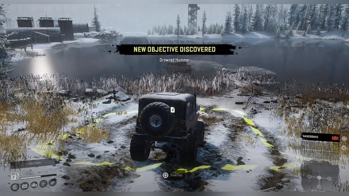 Далее нужно подъехать к цепочке островков, расположенных в нижней части озера, справа от продуктопровода. Недалеко от построек вы увидите болтающийся в воде остов «Хаммера». Дело за малым — вытолкать его лебедкой на сушу, после чего он появится в вашем гараже. Его детали впоследствии можно модернизировать.