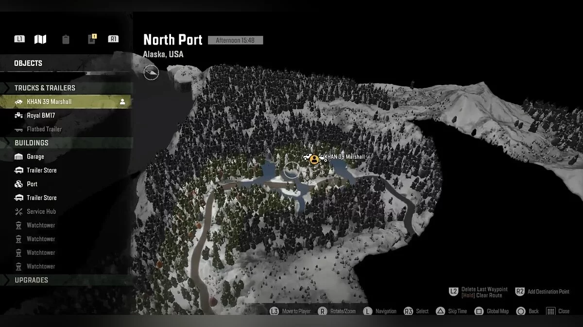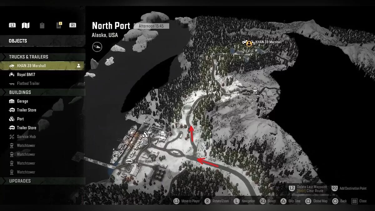 За этим тягачом придется отправиться на Аляску, в локацию «Северный порт». Выехав из гаража двигайтесь в юго-западном направлении, по дороге, ведущей к порту и магазину прицепов. Не доезжая, поверните направо и двигайтесь в сторону водоема, частично затопившего шоссе.