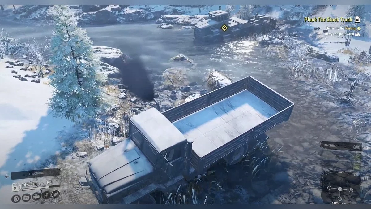 Теперь не торопитесь — вы увидите квест «вытащить застрявший грузовик» (Pluck the stuck truck). Примите его, после чего вам надо будет съехать с дороги и проковылять немного по бездорожью вниз по реке, к маркеру, отмеченному игрой. Этот грузовик вы с собой и заберете.