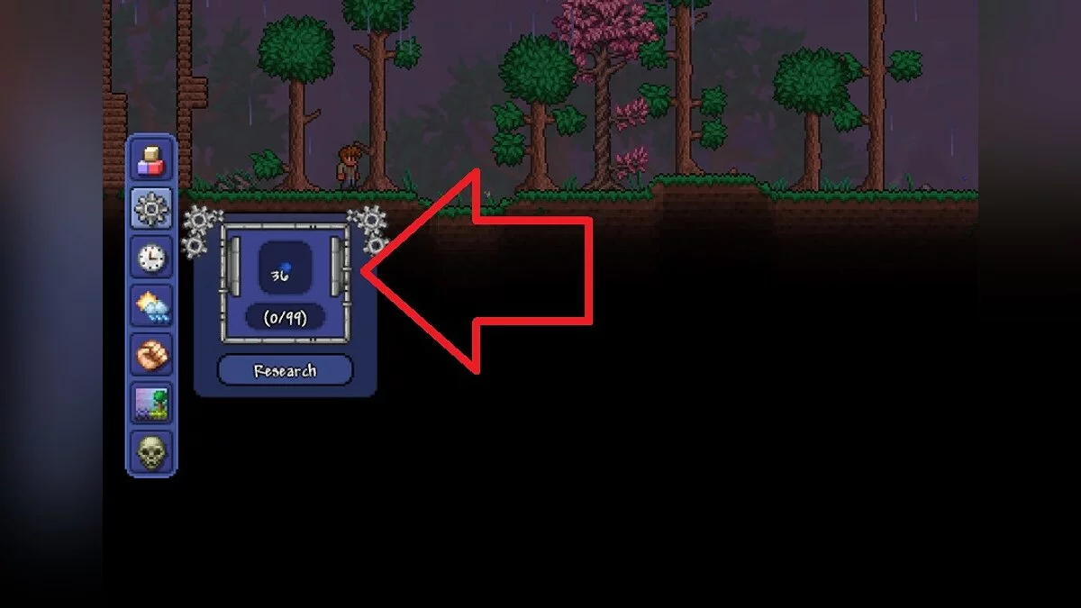 По сути, именно эти две возможности и позволят получить неограниченное количество предметов. Но стоит понимать, что сходу ничего не выйдет. Чтобы получить доступ к бесконечному запасу определенного предмета, необходимо найти его и собрать достаточное количество. Далее откройте меню исследования (Research Menu) и перетащите предмет в ячейку: