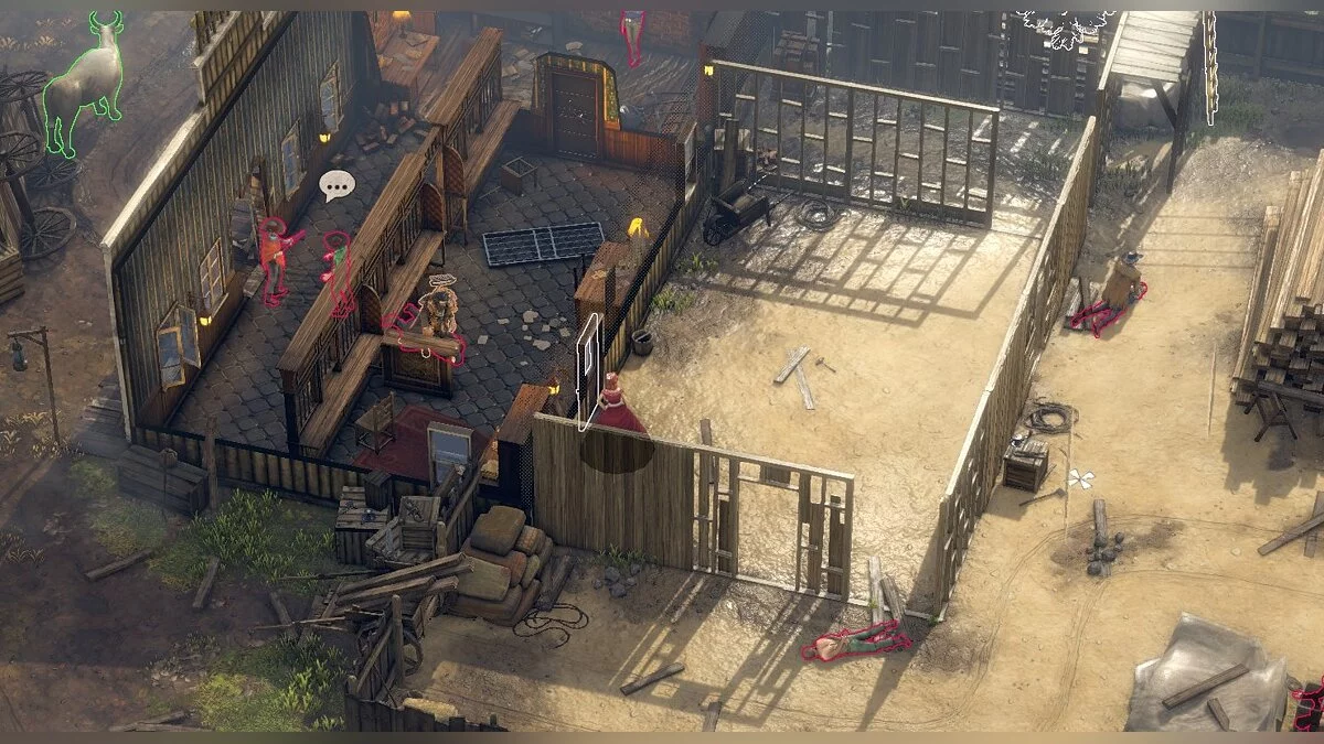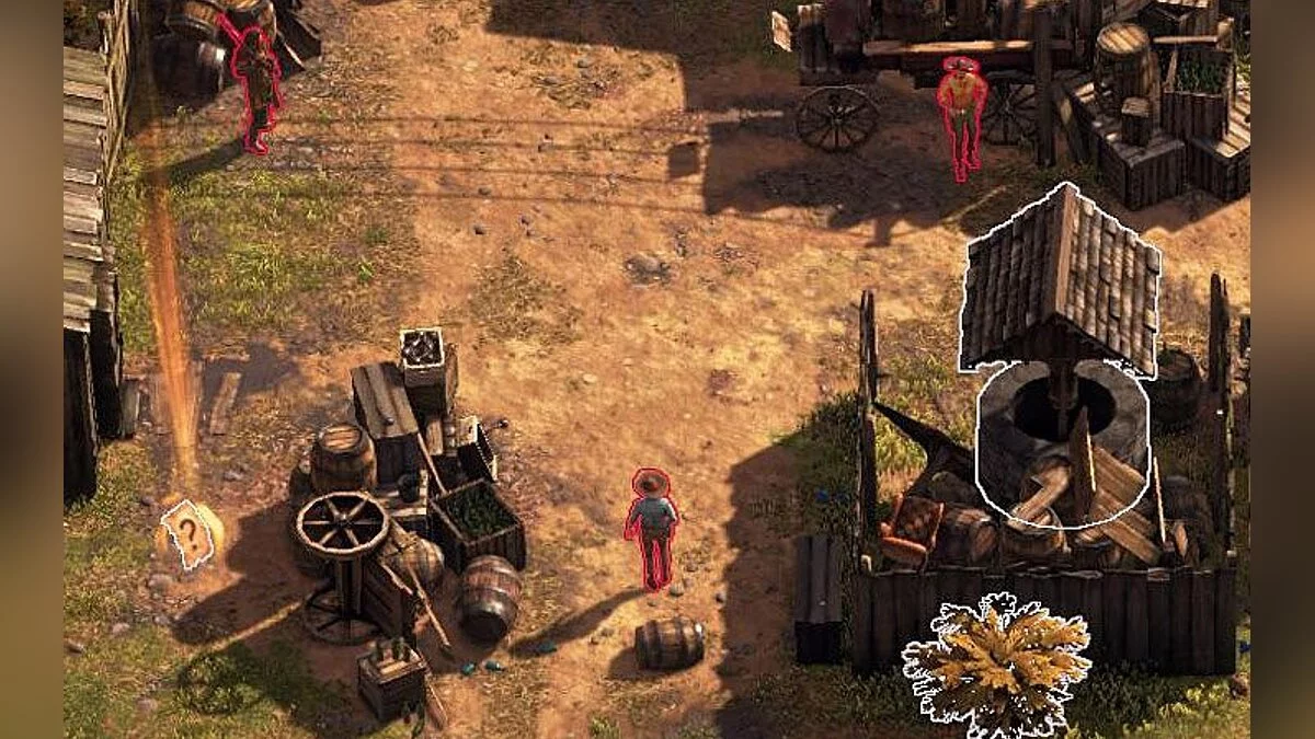 Одной из наиболее полезных функций в Desperados 3 является возможность выделения интерактивных объектов и персонажей вокруг одним нажатием клавиши. Поскольку, как и в Shadow Tactics, карту можно вращать и приближать, эта функция очень помогает при прохождении игры. Выделять объекты из вашего окружения рекомендуется в начале миссии, чтобы заранее осмотреть карту вокруг вас. Уделите особое внимание всем NPC, местам и объектам, с которыми можно взаимодействовать. Не забывайте, что на локациях имеется множество укрытий, тихих местечек для запрятывания трупов, перешейков и проходов. Интерактивными объектами могут быть квестовые предметы, которые можно подобрать (например, яд) или элементы окружения, помогающие избавляться от противников (например, кусок стены можно опрокинуть на ничего не подозревающих врагов).