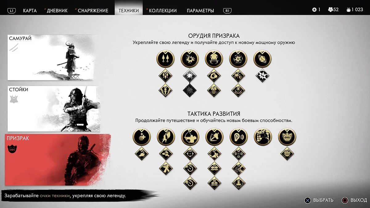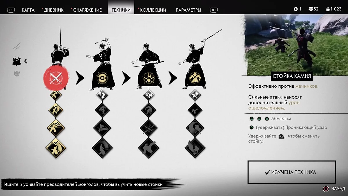Для прокачки способностей вам понадобятся очки техники, которые можно получить, увеличивая шкалу легенды. Для этого помогайте NPC и выполняйте задания. В плане выбора навыков, которые следует прокачать в первую очередь, можно выделить следующие техники: «Идеальное парирование», «Отклонение стрел», «Уклонение», «Неотвратимый меч», «Неотвратимое копье», все комбинации в стойке камня, «Зазубренные клинки», «Порох», «Концентрация», «Расширенная серия противоборств» и «Железная воля».