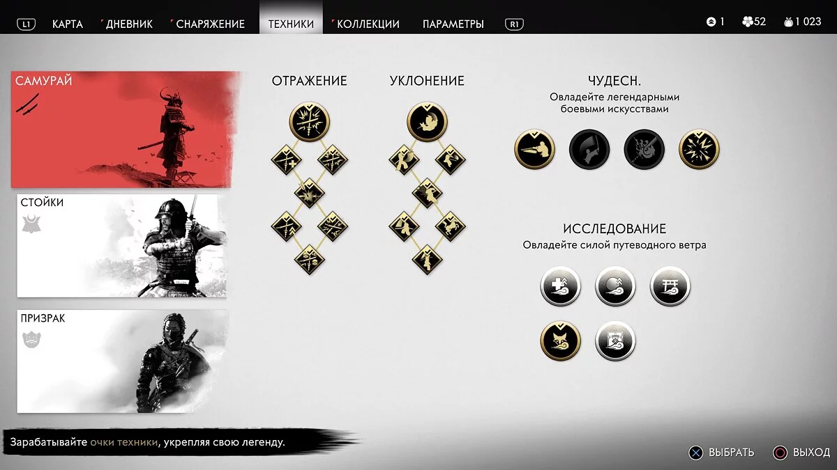 Если вы хотите пройти игру по стелсу, вам следует прокачать «Мастер цепи убийств» и «Инстинкт убийцы». Кроме того, для облегчения поисков горячих источников (увеличивает максимальное здоровье), тренировочных площадок (повышает количество очков решимости), святилищ синто (там находятся обереги), лисьих нор (повышает количество ячеек оберегов) и предметов кастомизации (шляпы, наборы мечника, повязки и маски) обязательно откройте все техники в разделе «Исследование».
