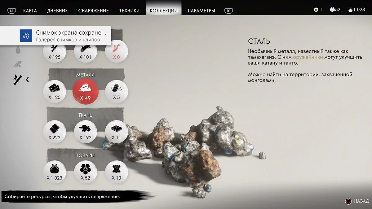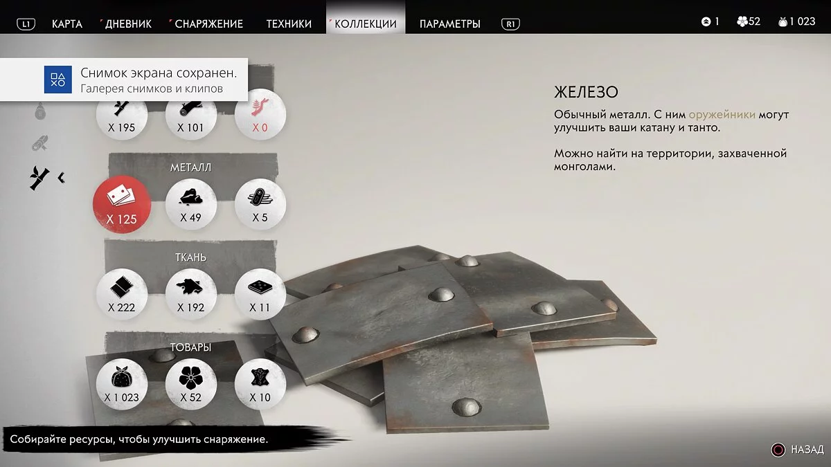 Апгрейду поддаются доспехи, клинок и лук. Для улучшения снаряжения вам понадобятся ресурсы: припасы, сталь, золото, полотно, тис и т.д. Как правило, большое количество этих вещей можно найти в лагерях монголов. Внимательно осматривайте юрты. Почти всегда там можно найти что-то полезное. Много ресурсов также будут давать вам в награду за выполнение определенных типов заданий. Зачастую это отвоевывание монгольских территорий. Чтобы посмотреть, какую именно награду вы получите, просто откройте карту и наведите курсор на иконку задания.