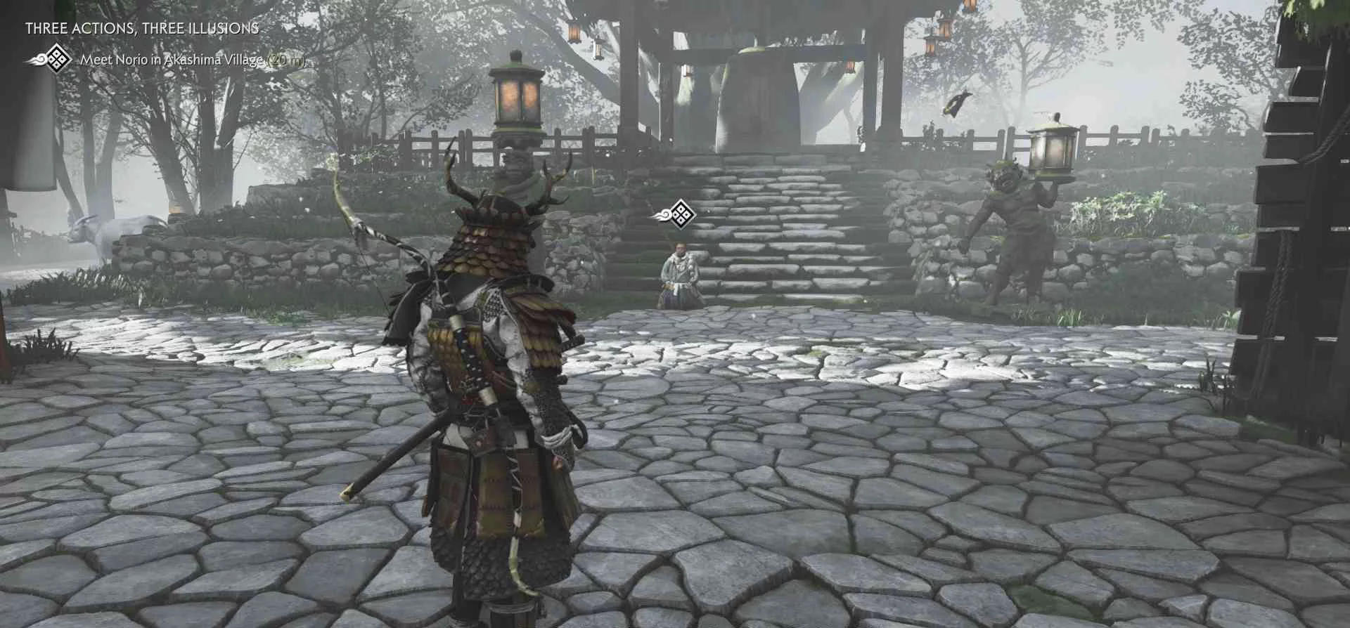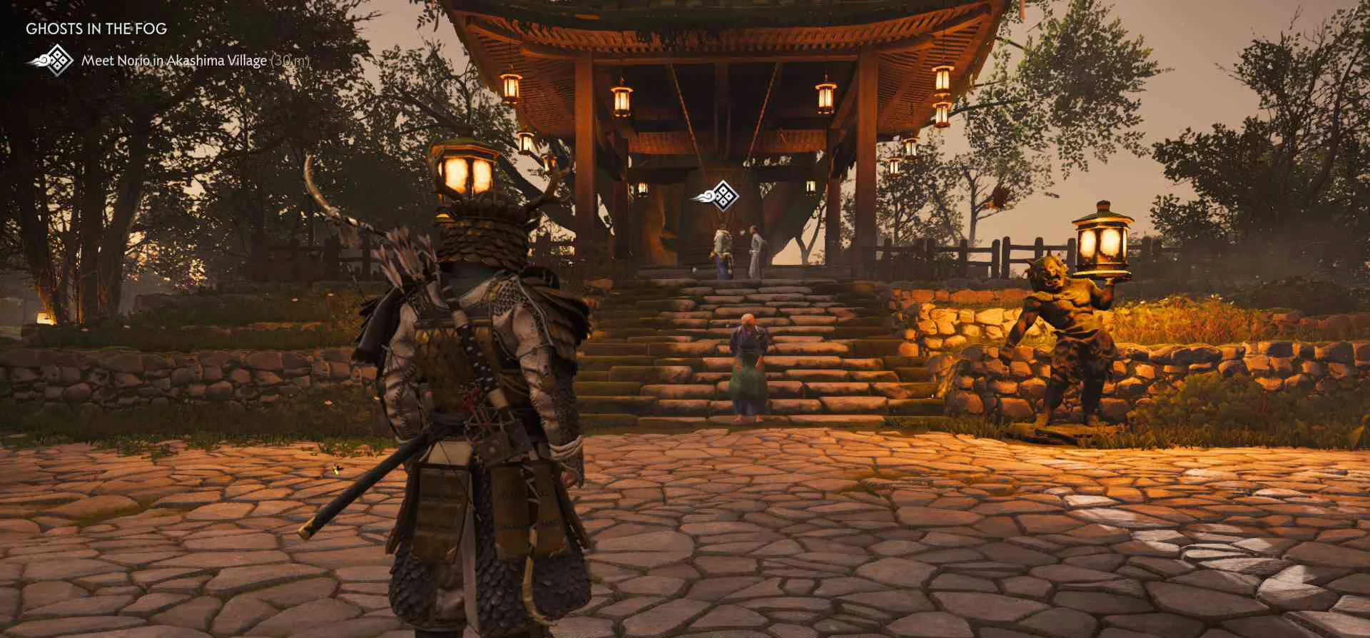 Монах-воин Норио сказал, что монах из кедрового храма помогает людям деревни Акашима. Норио попросил меня присоединиться к нему и поддержать их усилия по сопротивлению захватчикам.
