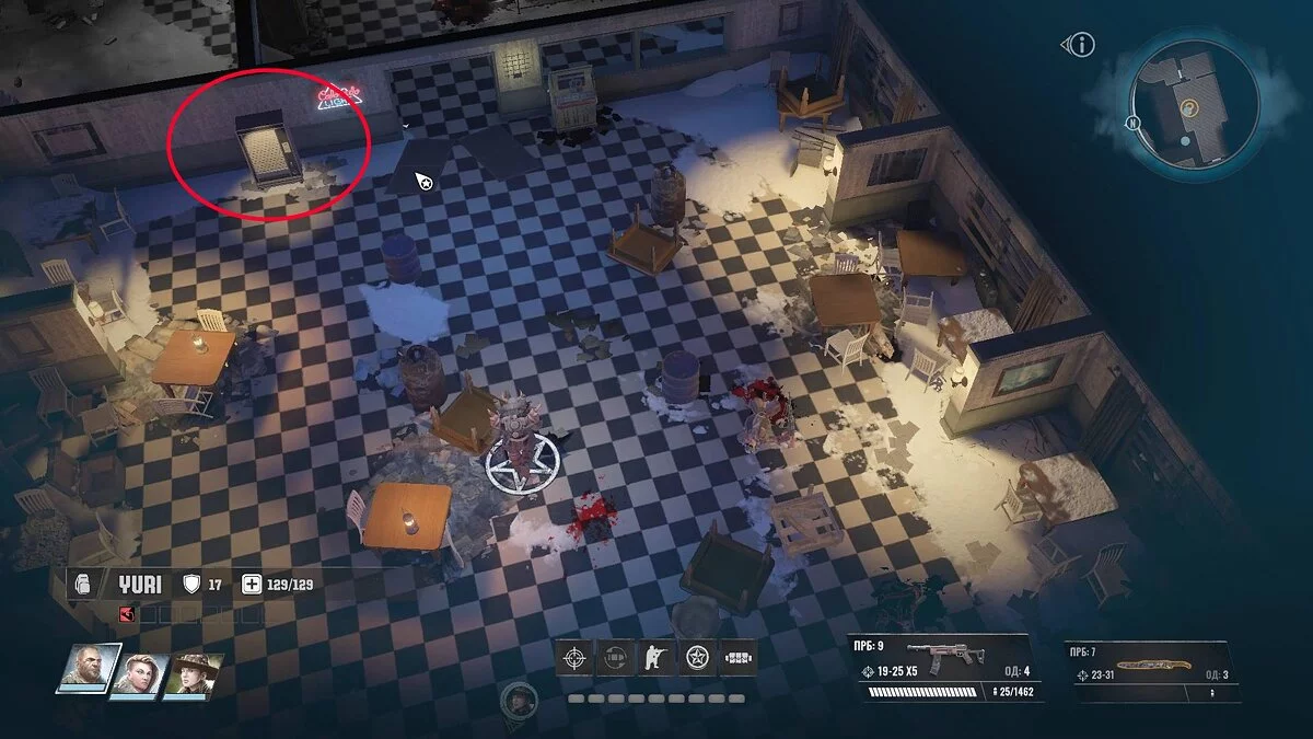 Если у вас есть персонаж с прокаченным навыком [Исподтишка: 9], то пройдите по платформе справа и войдите в Помещение охраны. Здесь вам пригодится еще один герой с навыком [Всезнайка: 9] для взлома терминала охраны. С этого момента за вашим лидером будет следовать Советский робот. Помимо этого, все охранные роботы в зданиях станут на вашу сторону. Вам остается лишь зачистить помещения на локации и отыскать Ди Диез.