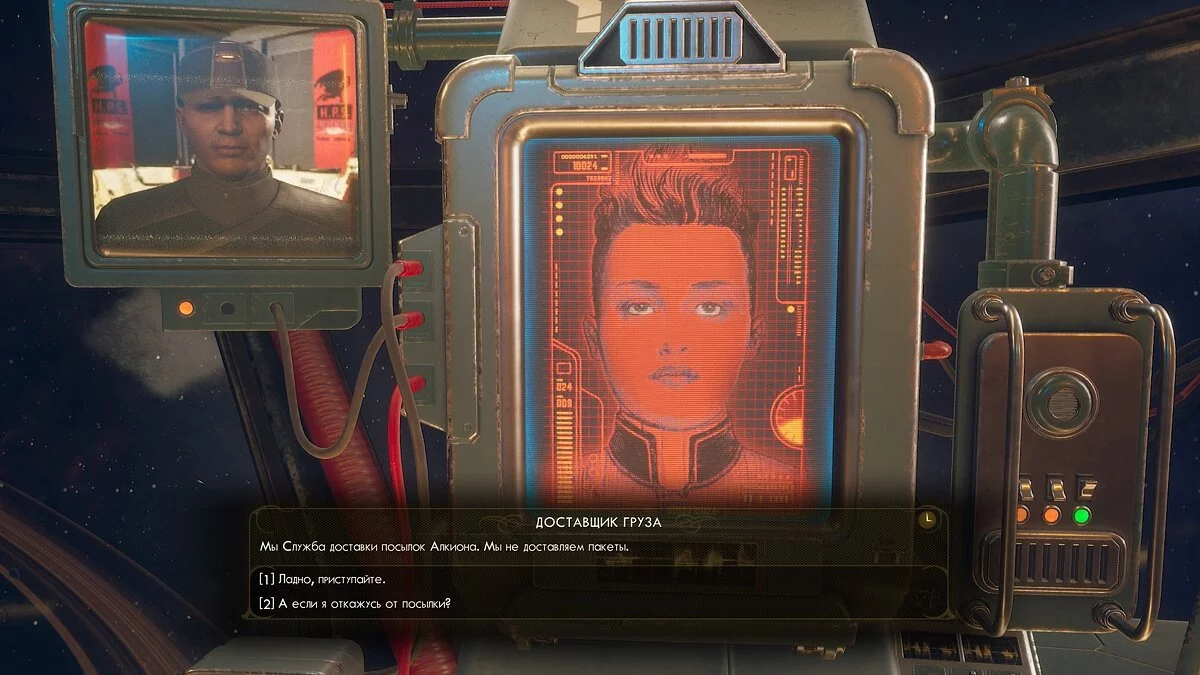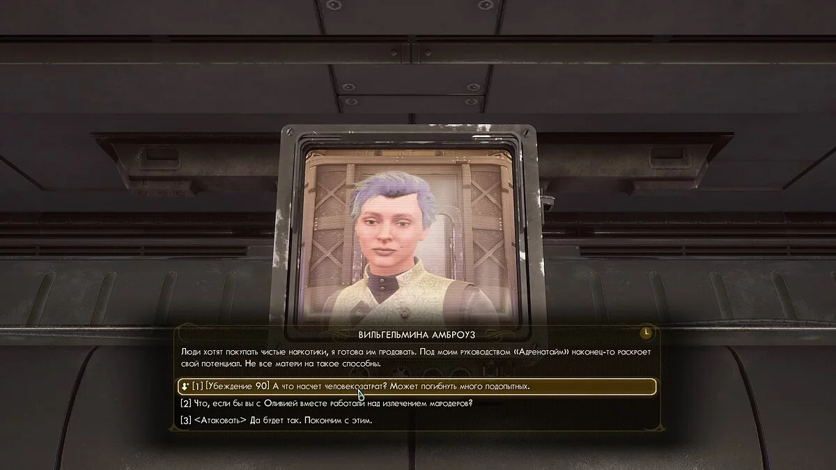 Когда дневник будет у вас, покиньте центр синтеза и вернитесь на борт «Безнадежного», подойдите к Аде и поговорите с Вильгельминой. Помимо стандартных ответов, вы также можете воспользоваться [Убеждением] и [Проницательностью]. В любом случае, после реплики главного героя в трансляцию подключится ее мать — Оливия.