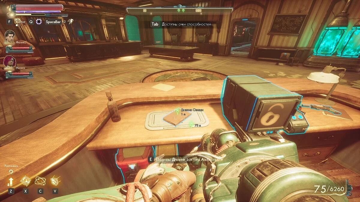 Вернитесь на корабль, используйте быстрое перемещение в локацию «Посадочная площадка на Горгоне» и следуйте в «Шпрысиный сарай». Поговорите с барменом. У него вы узнаете, что Лаки останавливался в этом заведении. Его комнату можно найти на третьем этаже. Осмотрите ее: возьмите со стола заметки Лаки о ходе дела, а также законсервированный глаз из сейфа.