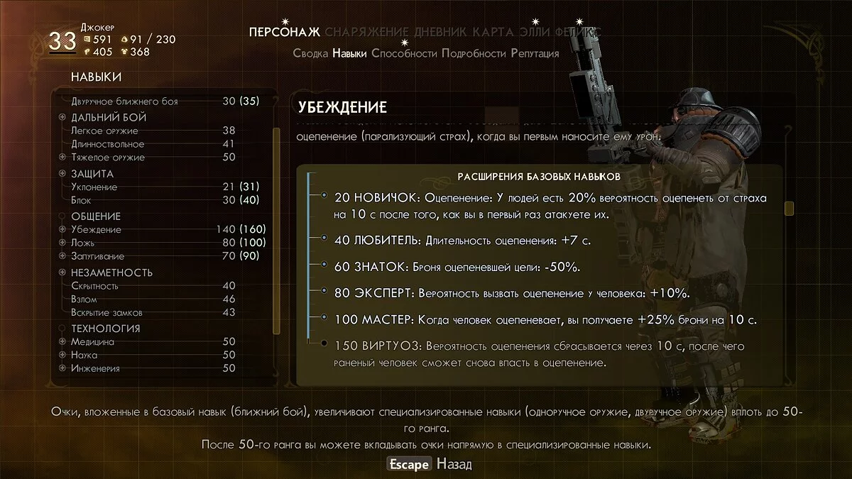 - Вдохновение: Находясь на «Безнадежном», спутники дают игроку бонус к навыкам в размере 10%.