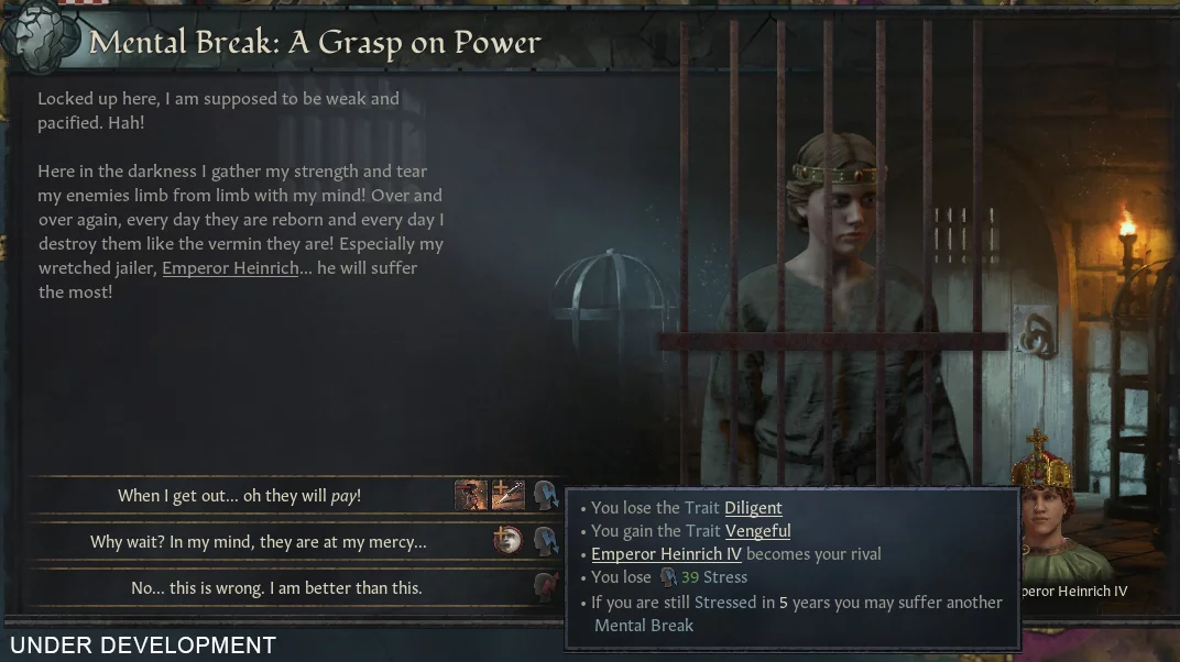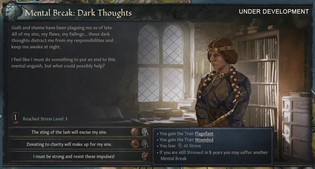 Управление целым государством — очень сложный процесс. Из-за принятия сложных решений, главный герой может испытывать стресс. Он накапливается со временем и может привести к определенным последствиям. Любые события могут оказать влияние на персонажа и остаться в его памяти на какое-то время.