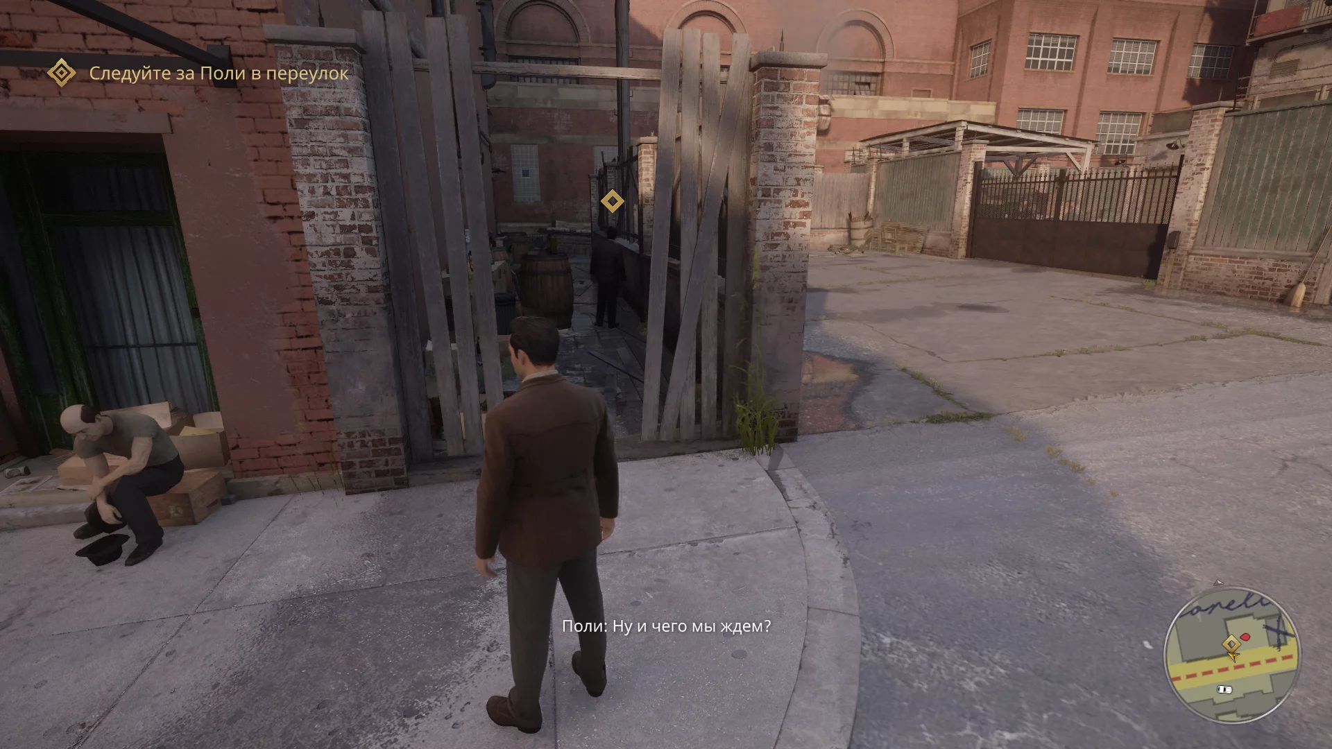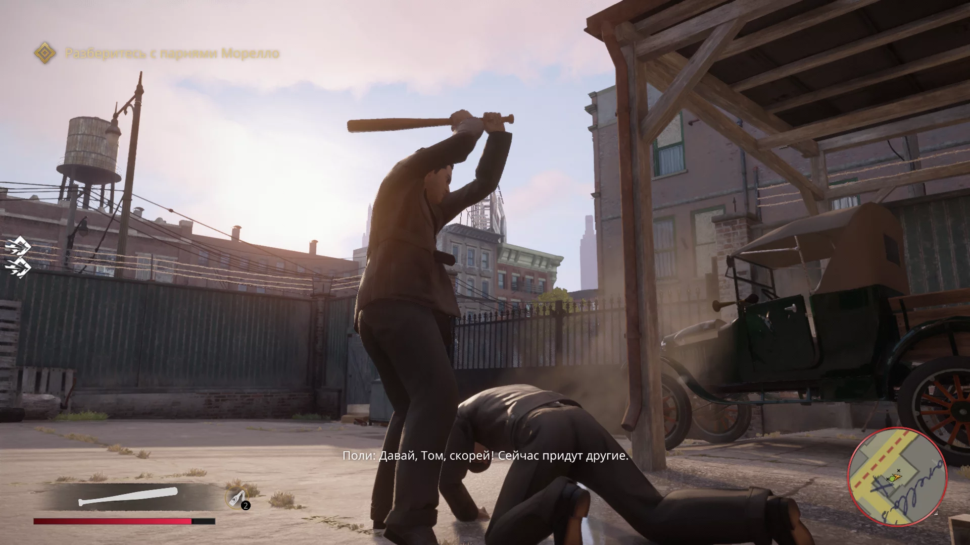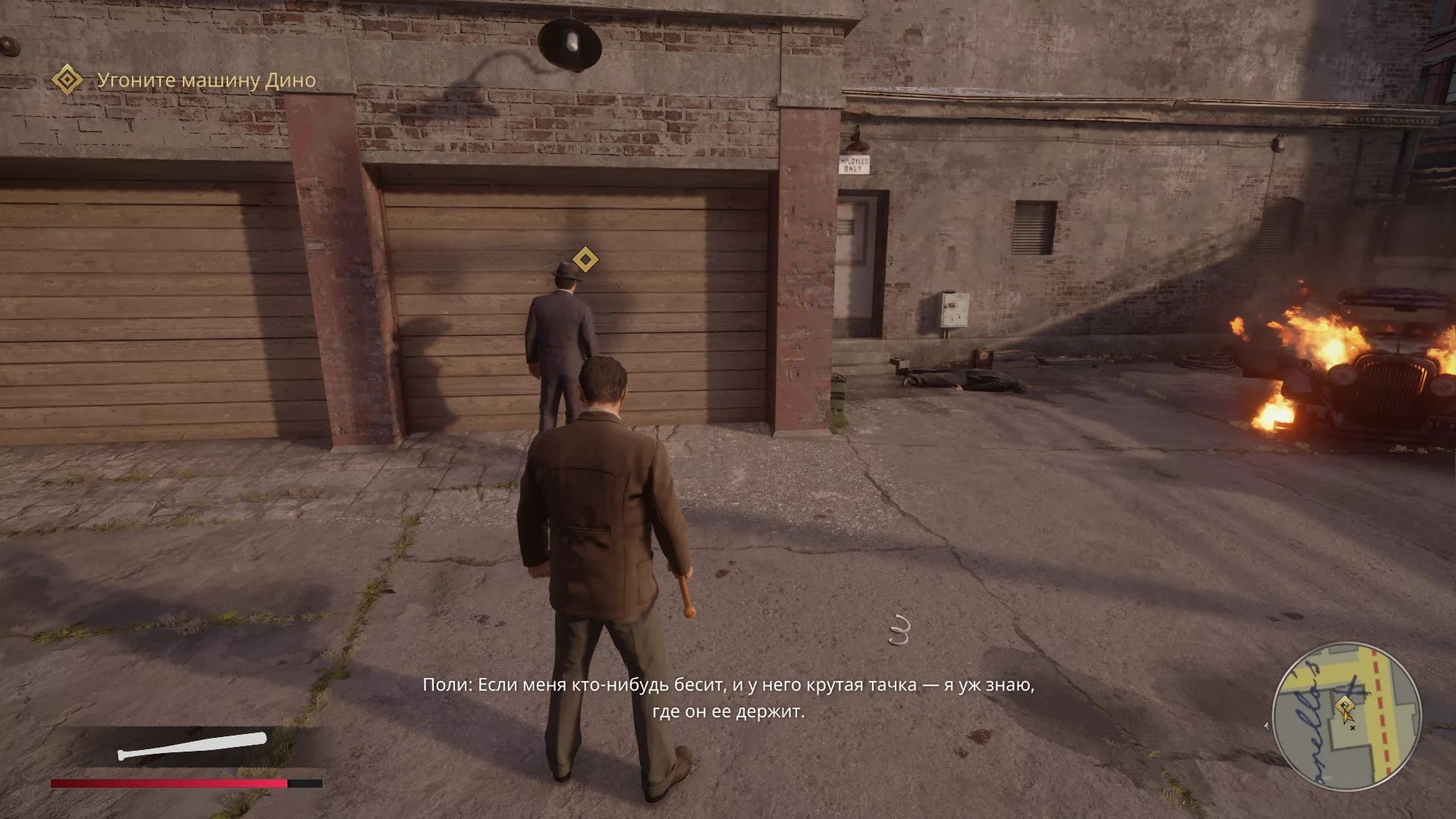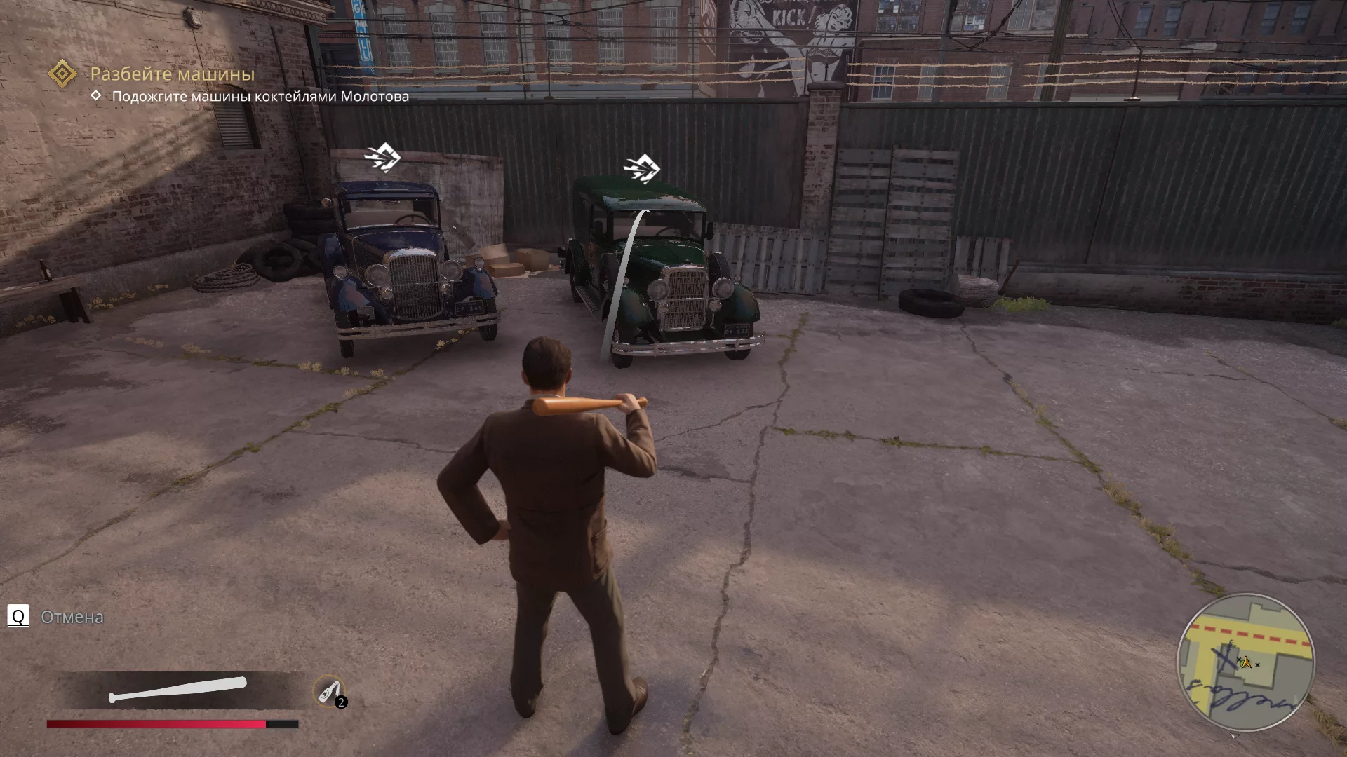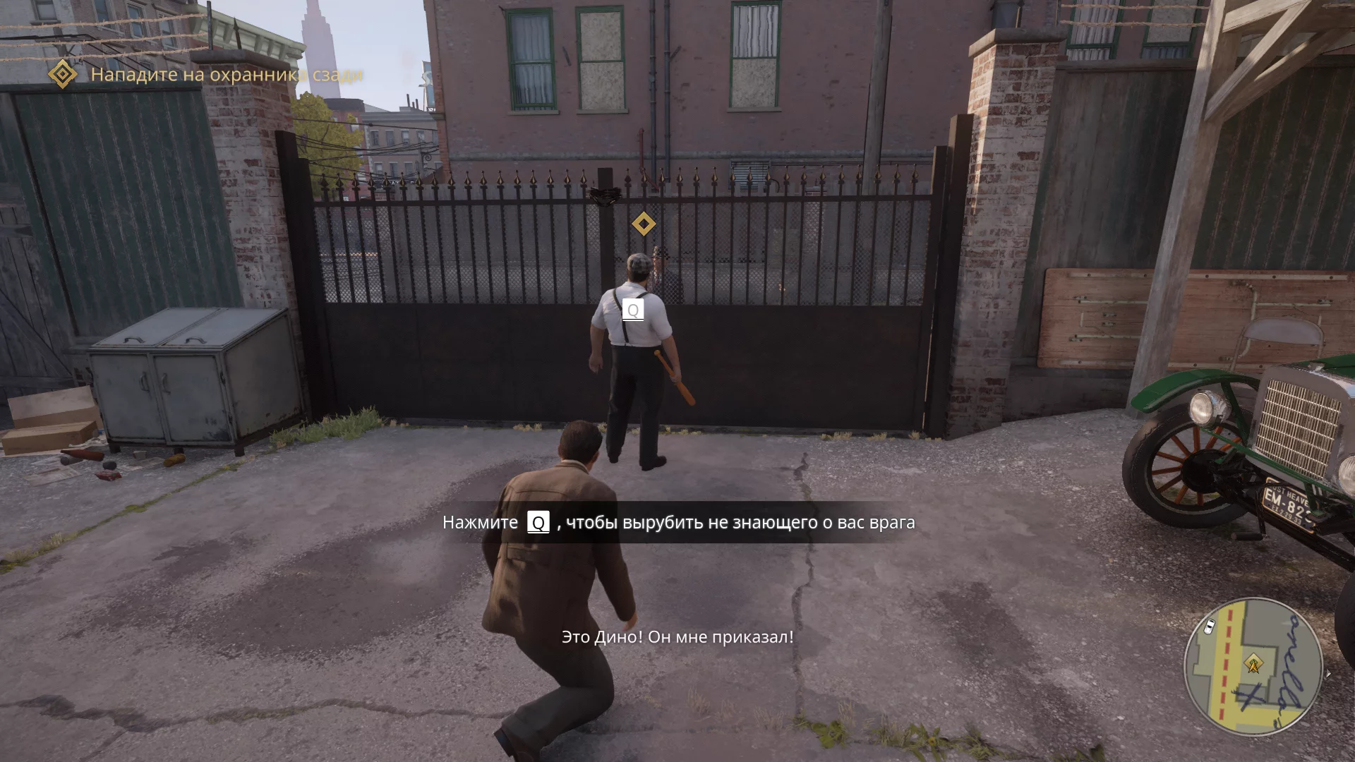 Отправляемся к бару Морелло. Идем за Поли и крадемся мимо гангстеров. Забираемся на крышу и спускаемся во двор. Вырубаем охранника, с которым говорит Поли. Достаем биту и разносим машину.