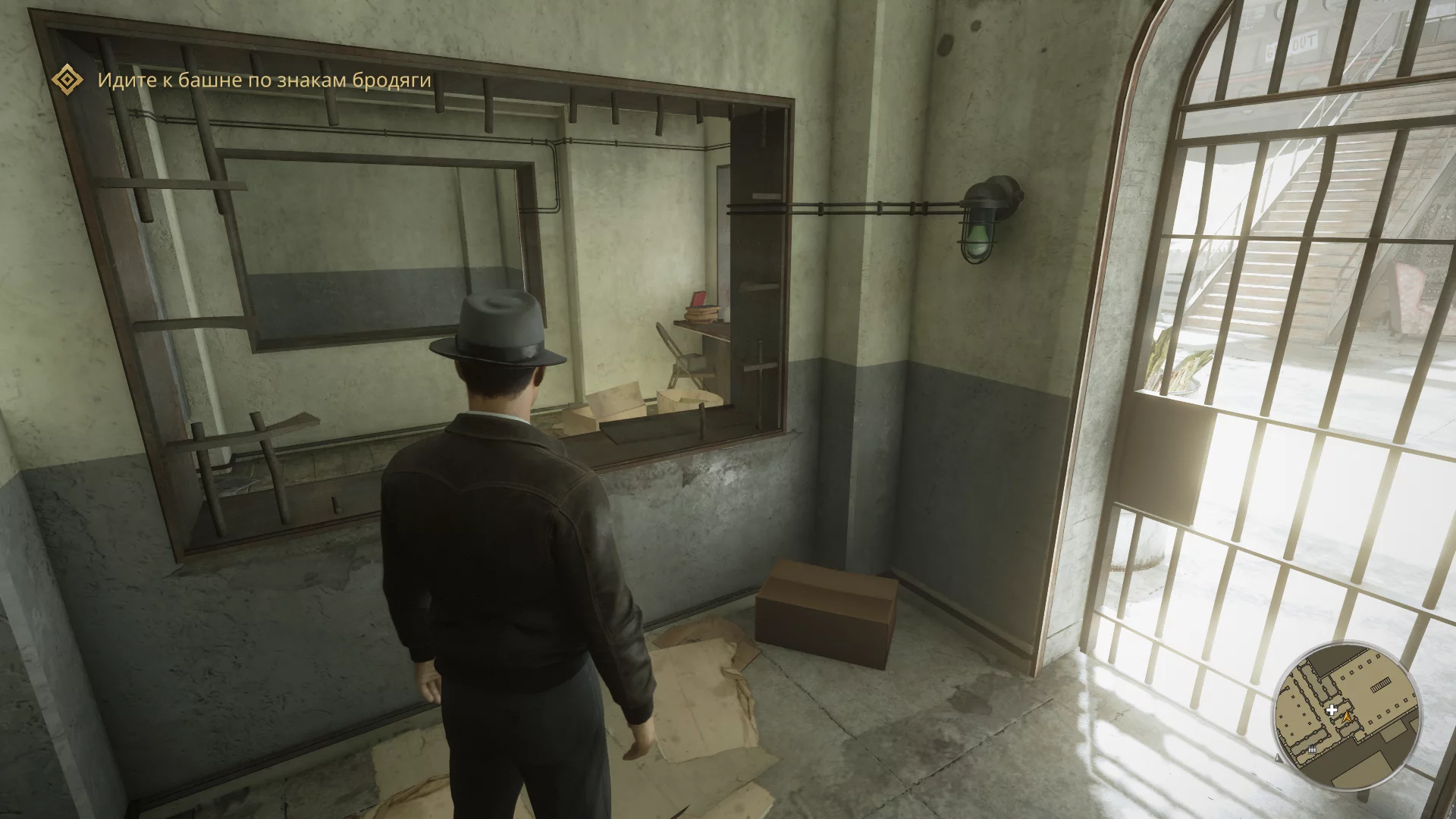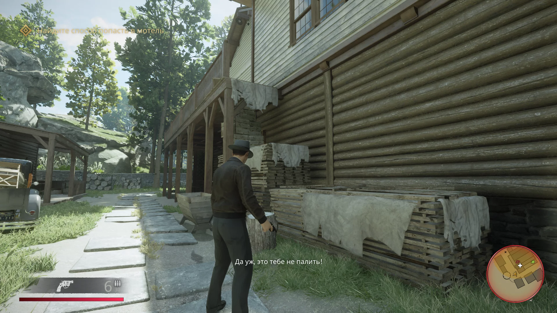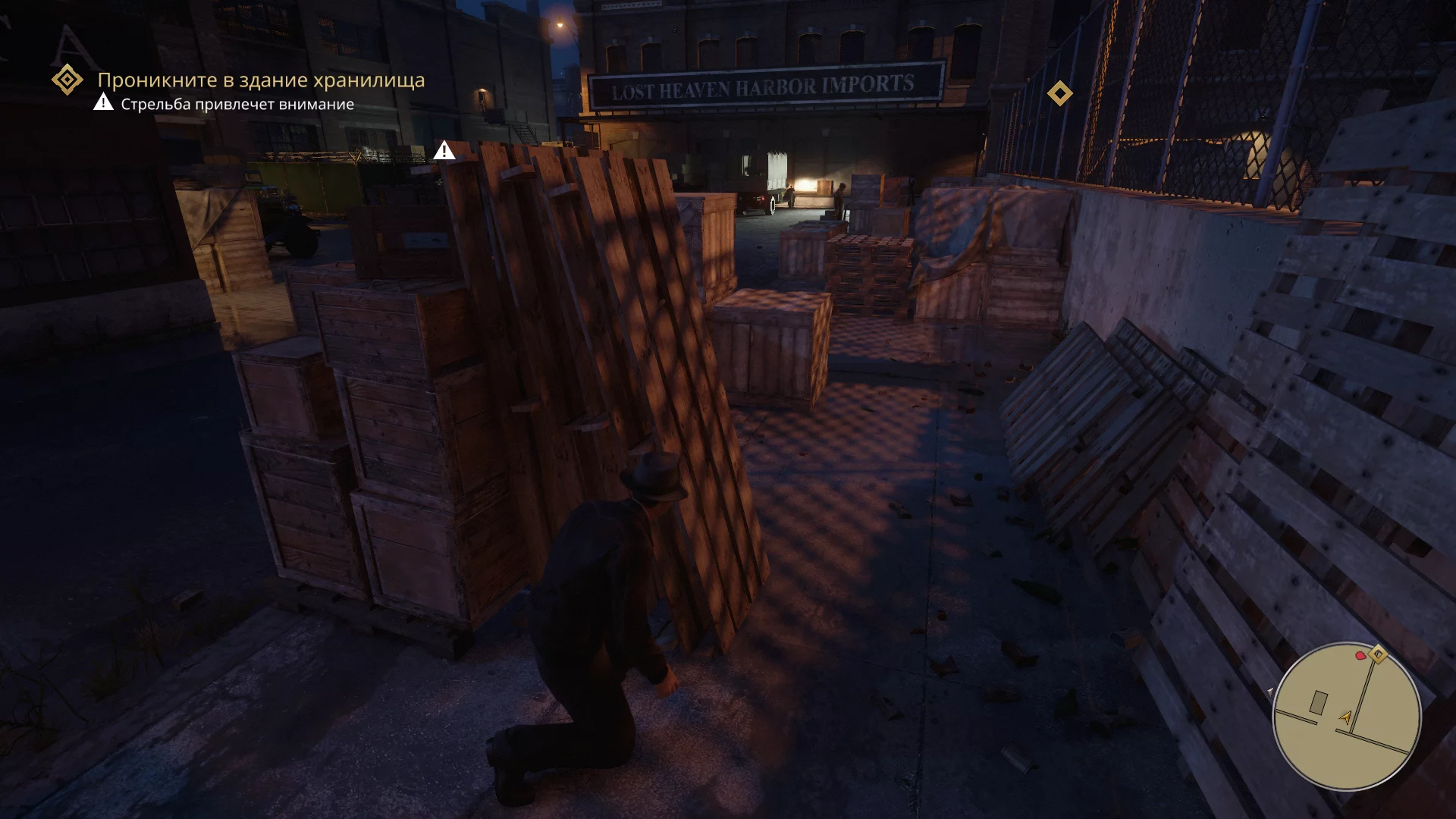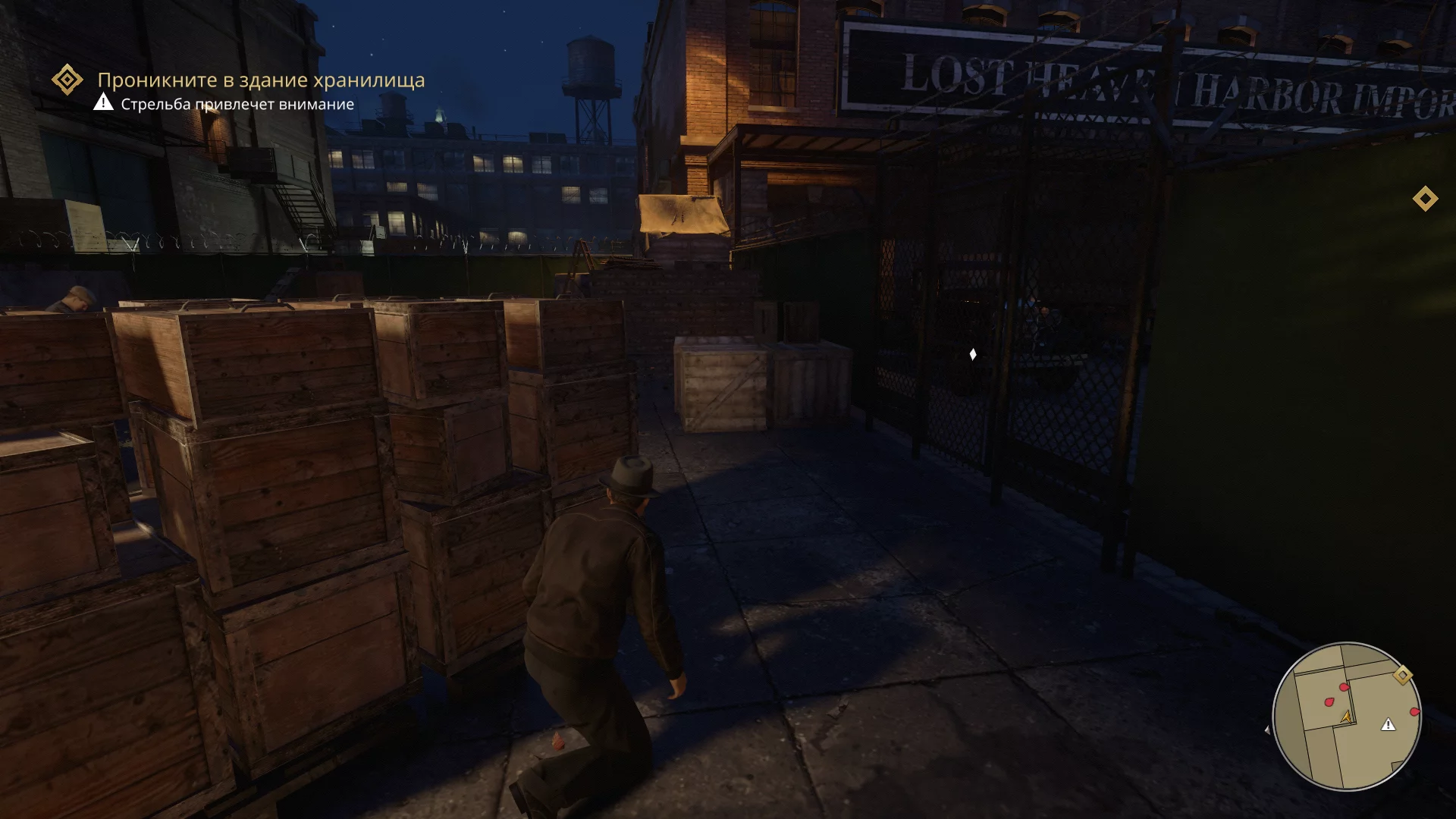 Отправляемся в мотель по третьему адресу. Тут все идет не по плану. Можно обойти здание сзади и тихо прокрасться внутрь, а можно просто всех перестрелять, не зря же нам выдали пистолет. Забираемся по коробкам на второй этаж.