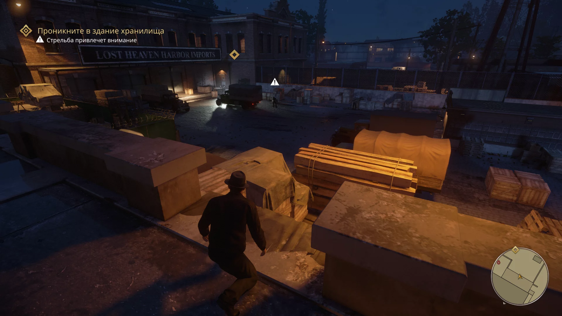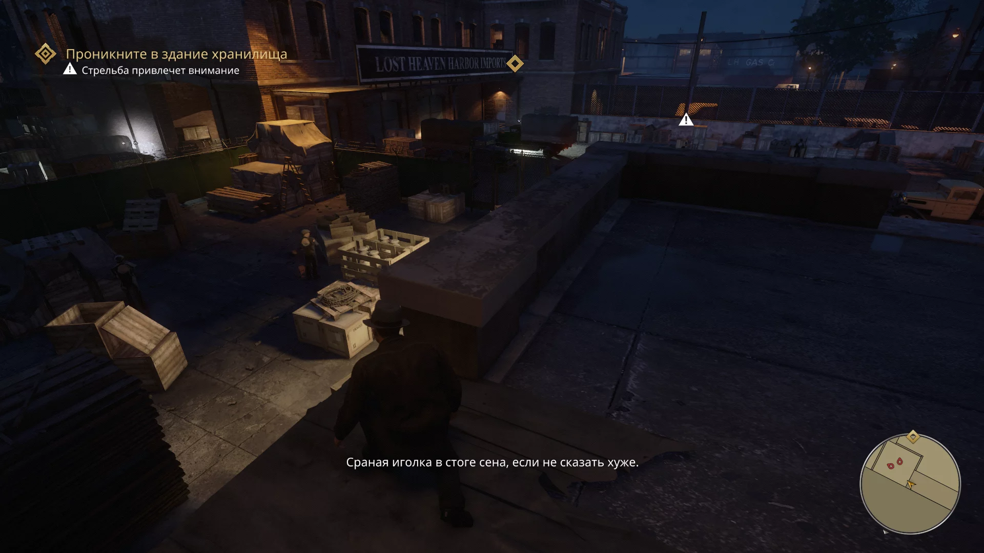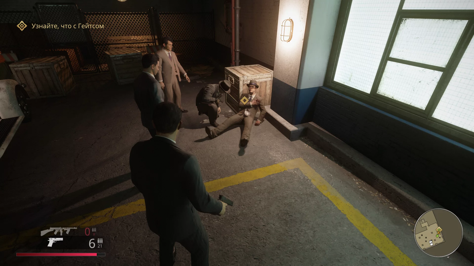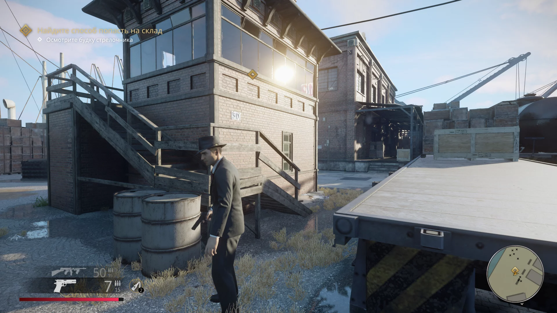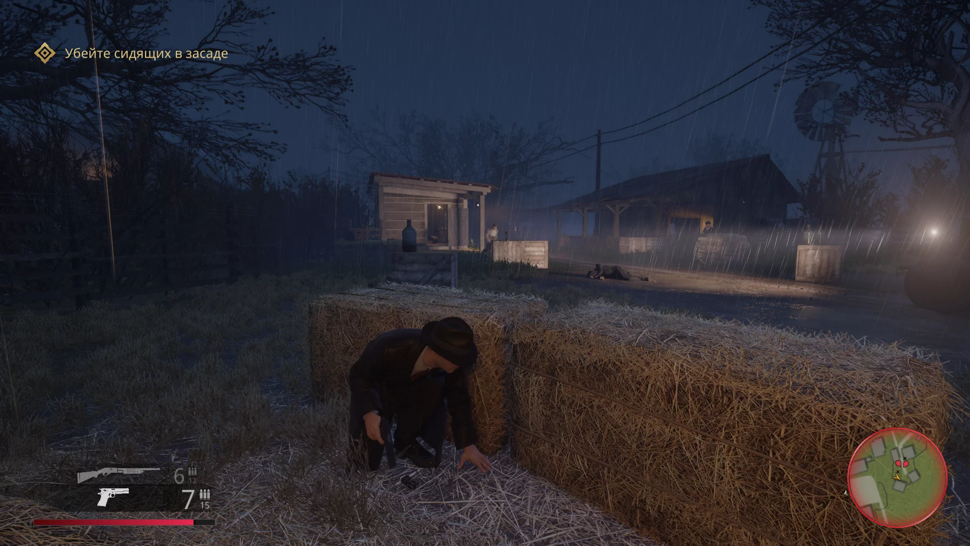 Отправляемся в мотель по третьему адресу. Тут все идет не по плану. Можно обойти здание сзади и тихо прокрасться внутрь, а можно просто всех перестрелять, не зря же нам выдали пистолет. Забираемся по коробкам на второй этаж.
