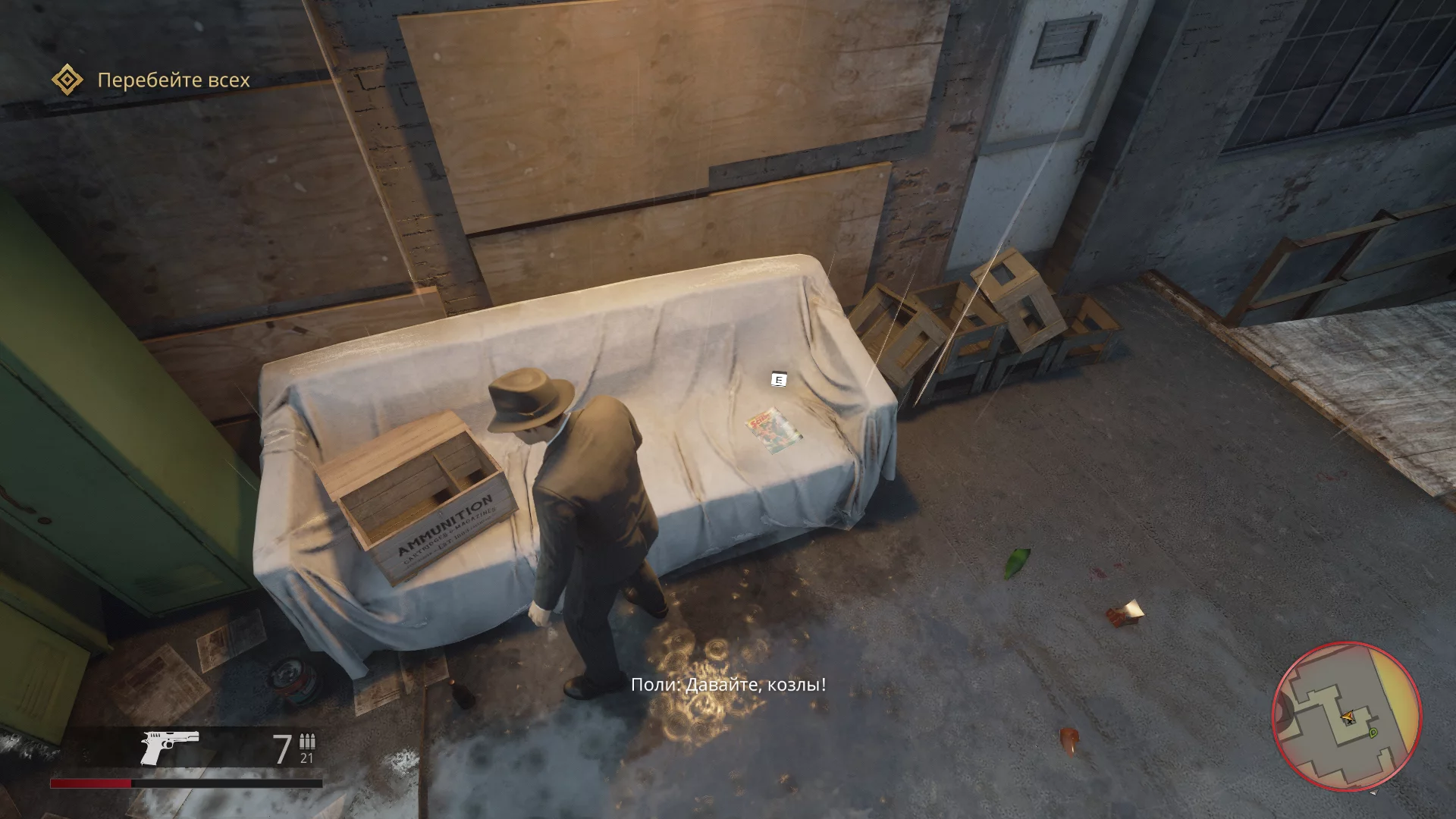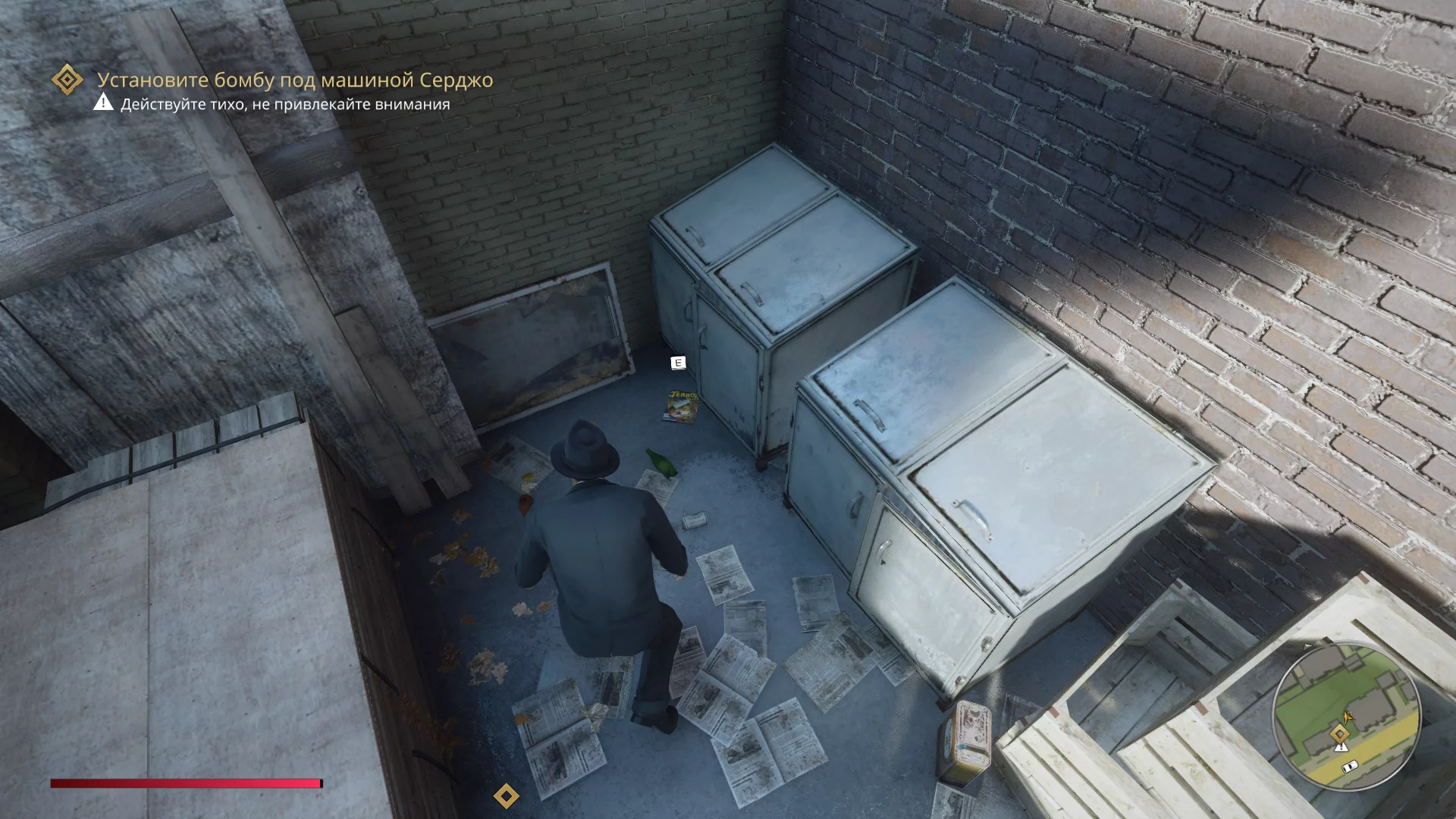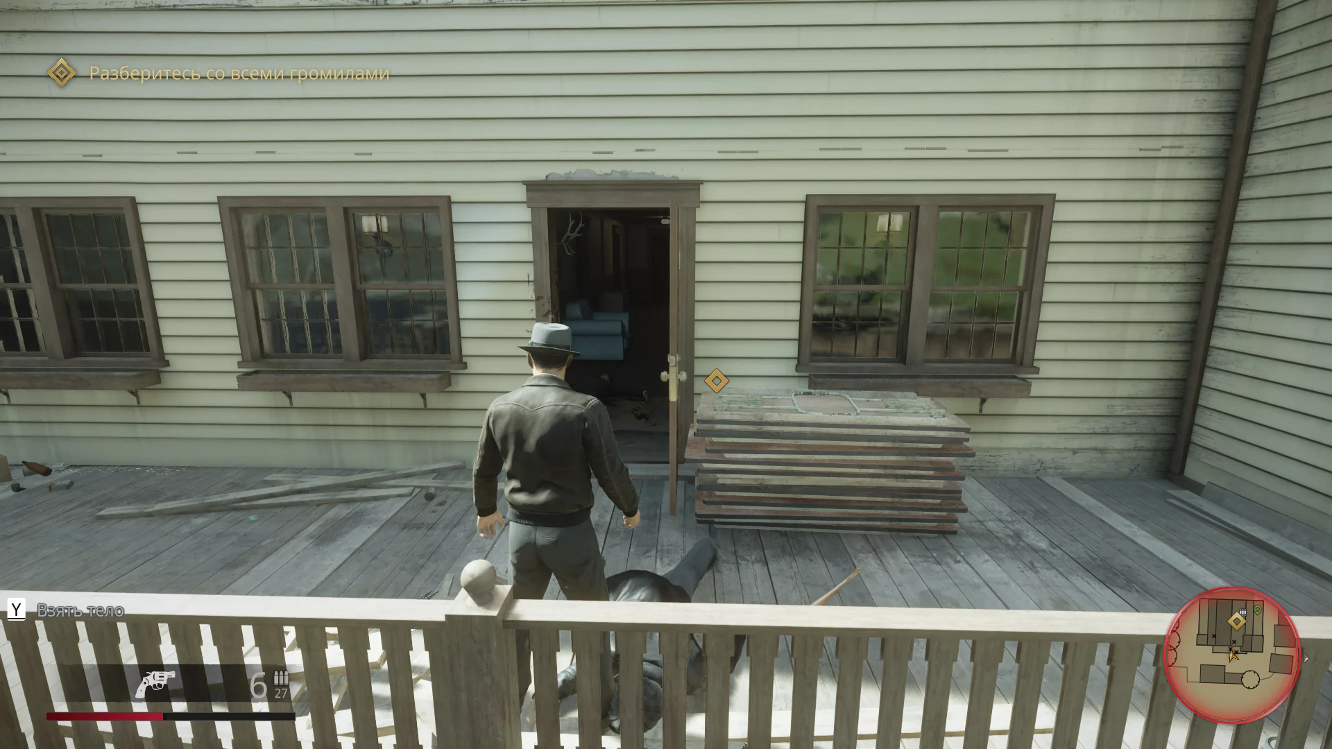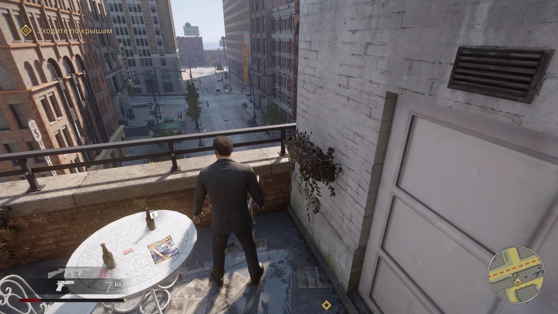 Отправляемся в мотель по третьему адресу. Тут все идет не по плану. Можно обойти здание сзади и тихо прокрасться внутрь, а можно просто всех перестрелять, не зря же нам выдали пистолет. Забираемся по коробкам на второй этаж.