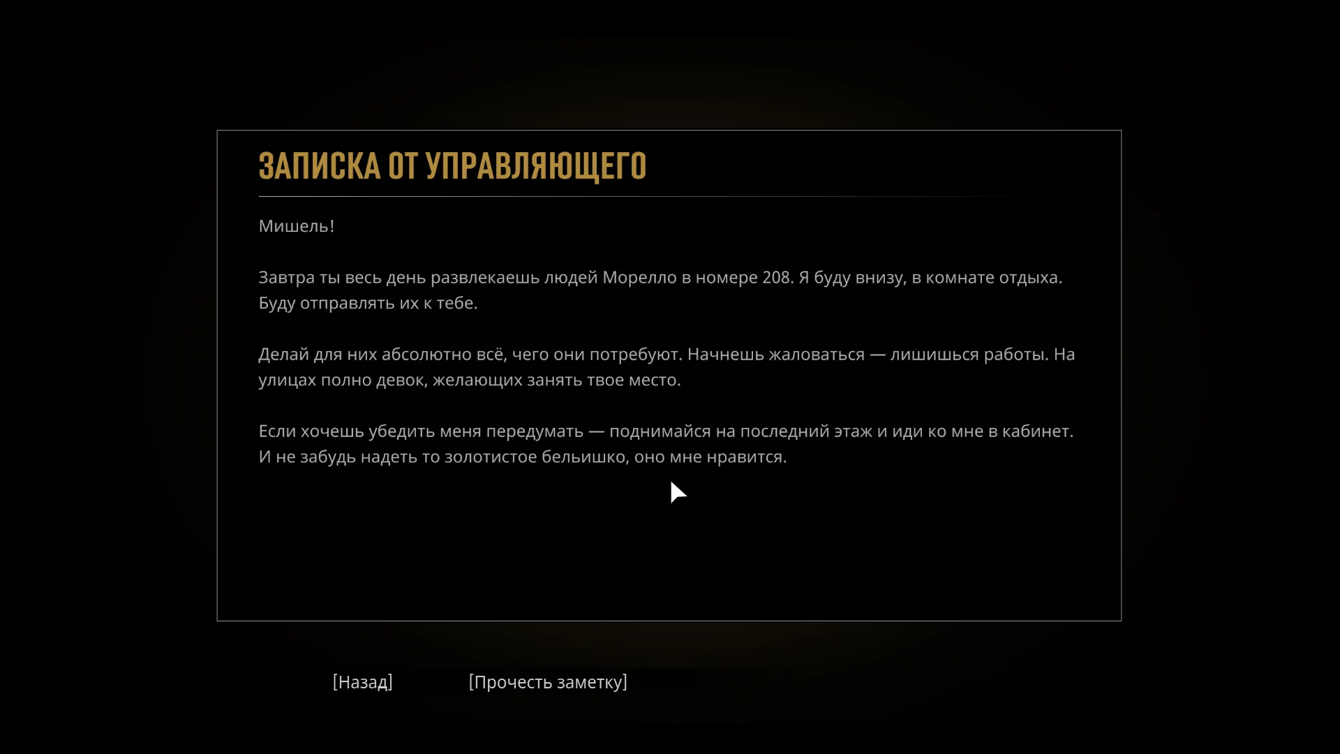 Проходим по второму этажу, спускаемся вниз и выходим на улицу. Обходим рабочих и вырубаем охранника. Поднимаемся по лестнице на второй этаж соседнего здания. Читаем записку в кабинете.