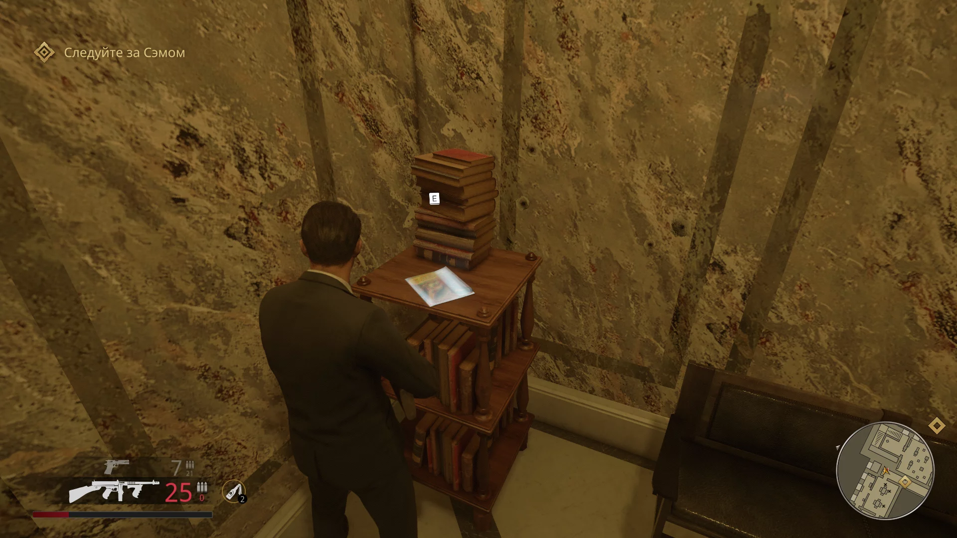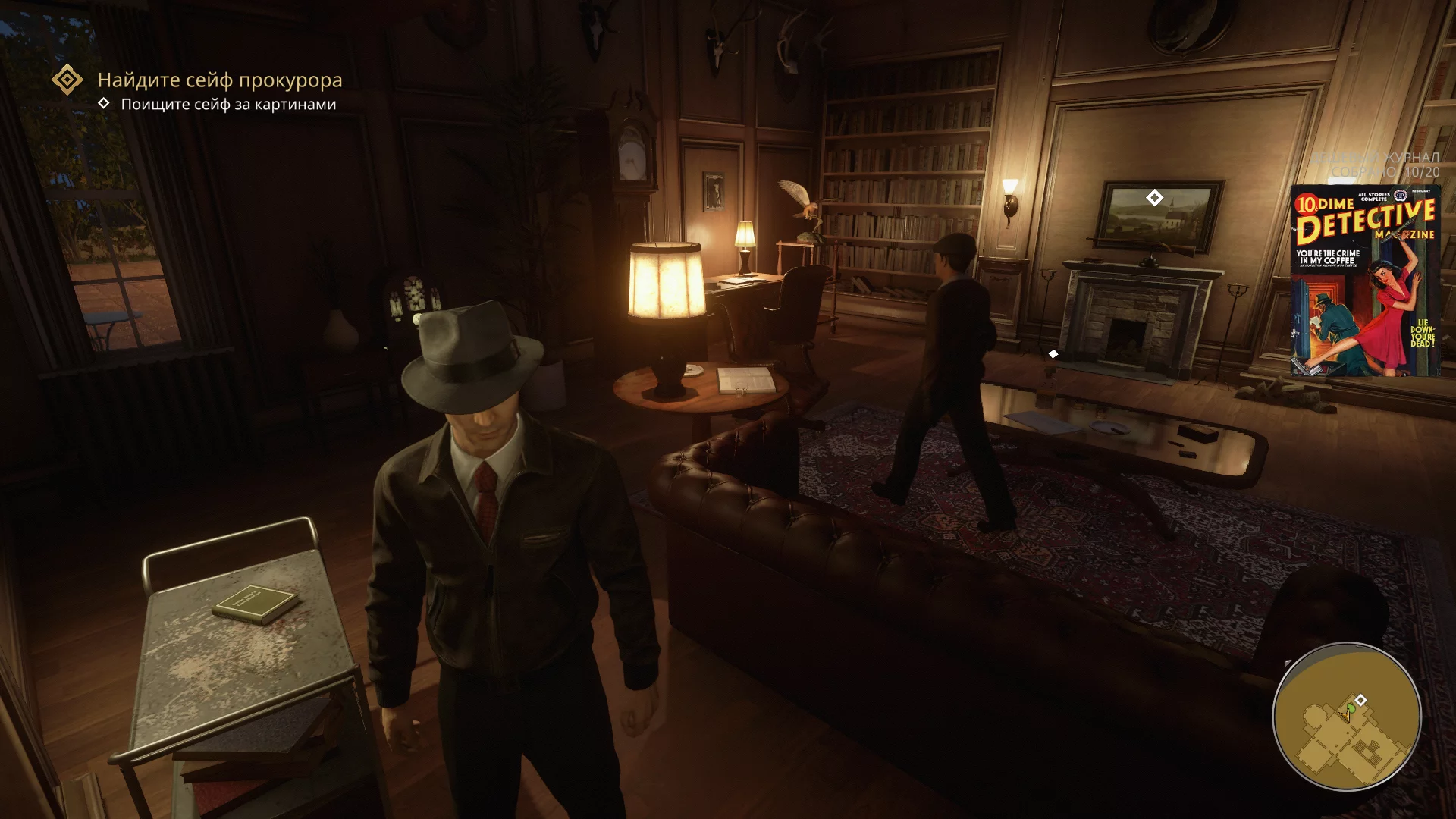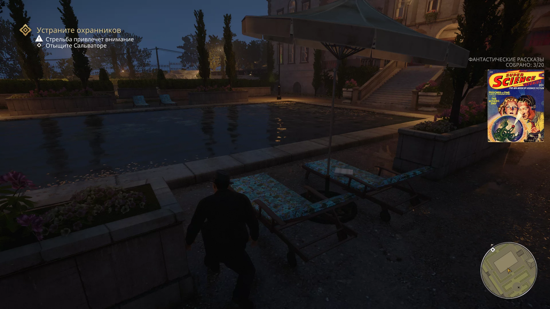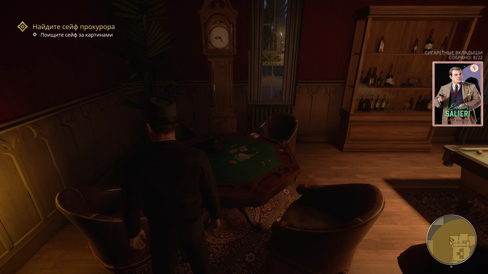 В верхней части также три охранника. Около бассейна можно найти книжку. Бегаем по саду за Сальваторе. Вламываемся внутрь и пытаемся найти сейф за одной из картин. В одной из комнат с картиной будет журнал. В комнате с другой стороны можно найти сигаретный вкладыш. Поднимаемся на второй этаж, нам нужна картина с портретом, на которой изображен мужчина с сигарой.