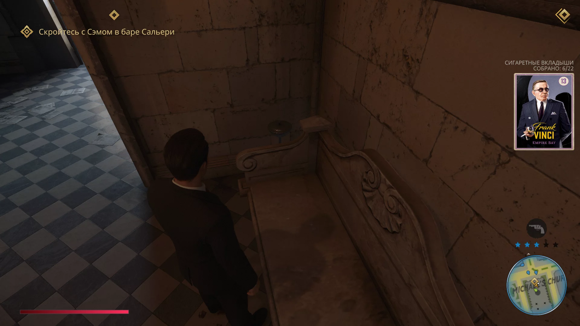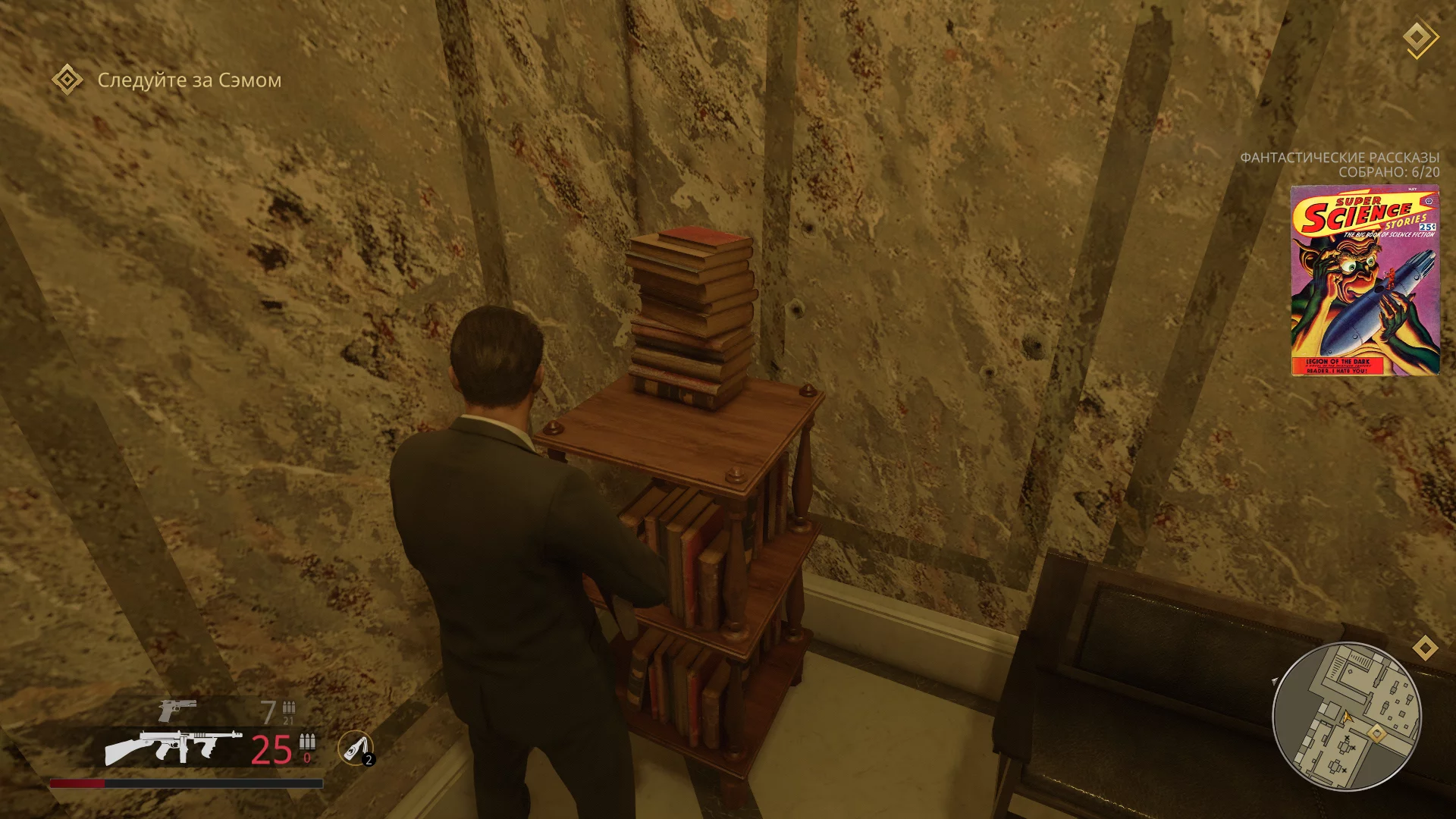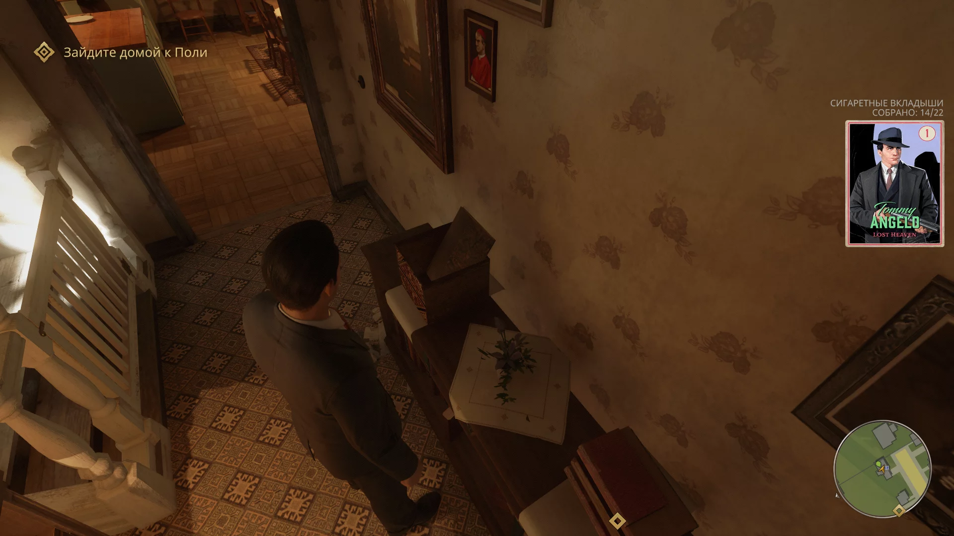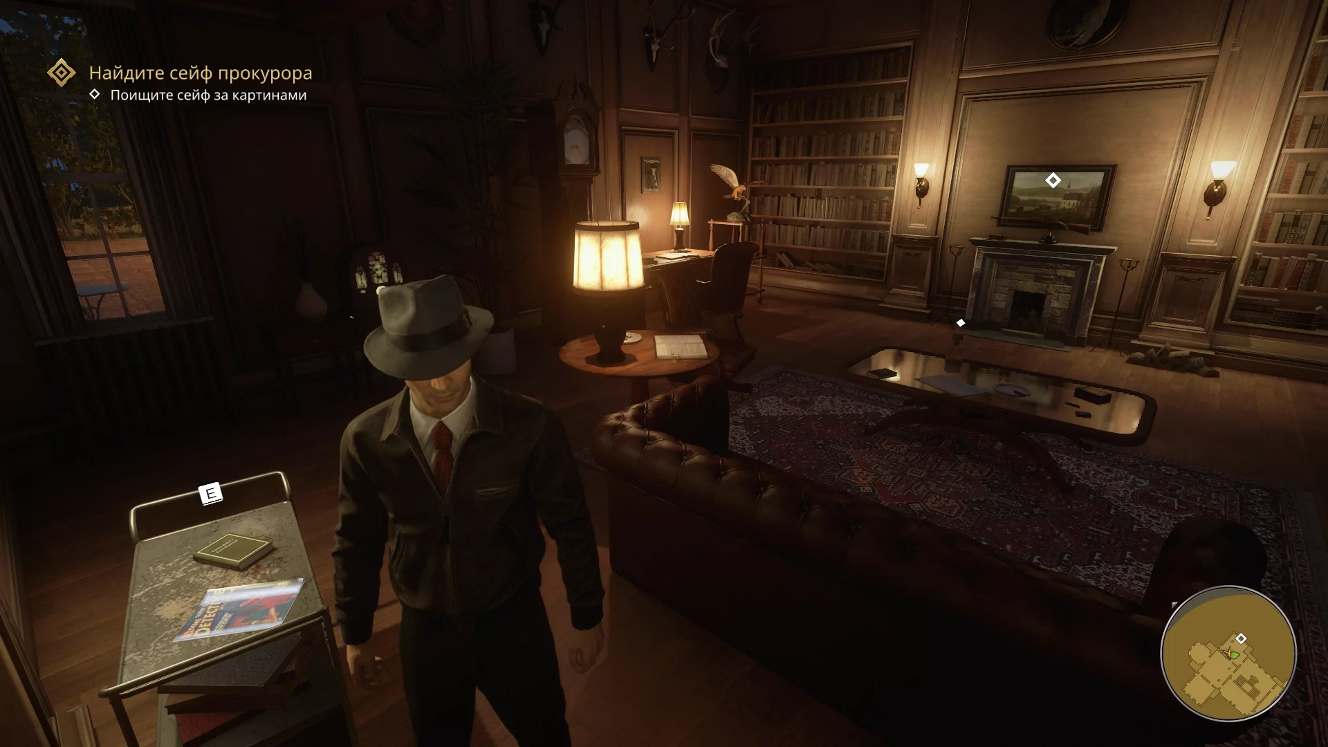 В верхней части также три охранника. Около бассейна можно найти книжку. Бегаем по саду за Сальваторе. Вламываемся внутрь и пытаемся найти сейф за одной из картин. В одной из комнат с картиной будет журнал. В комнате с другой стороны можно найти сигаретный вкладыш. Поднимаемся на второй этаж, нам нужна картина с портретом, на которой изображен мужчина с сигарой.