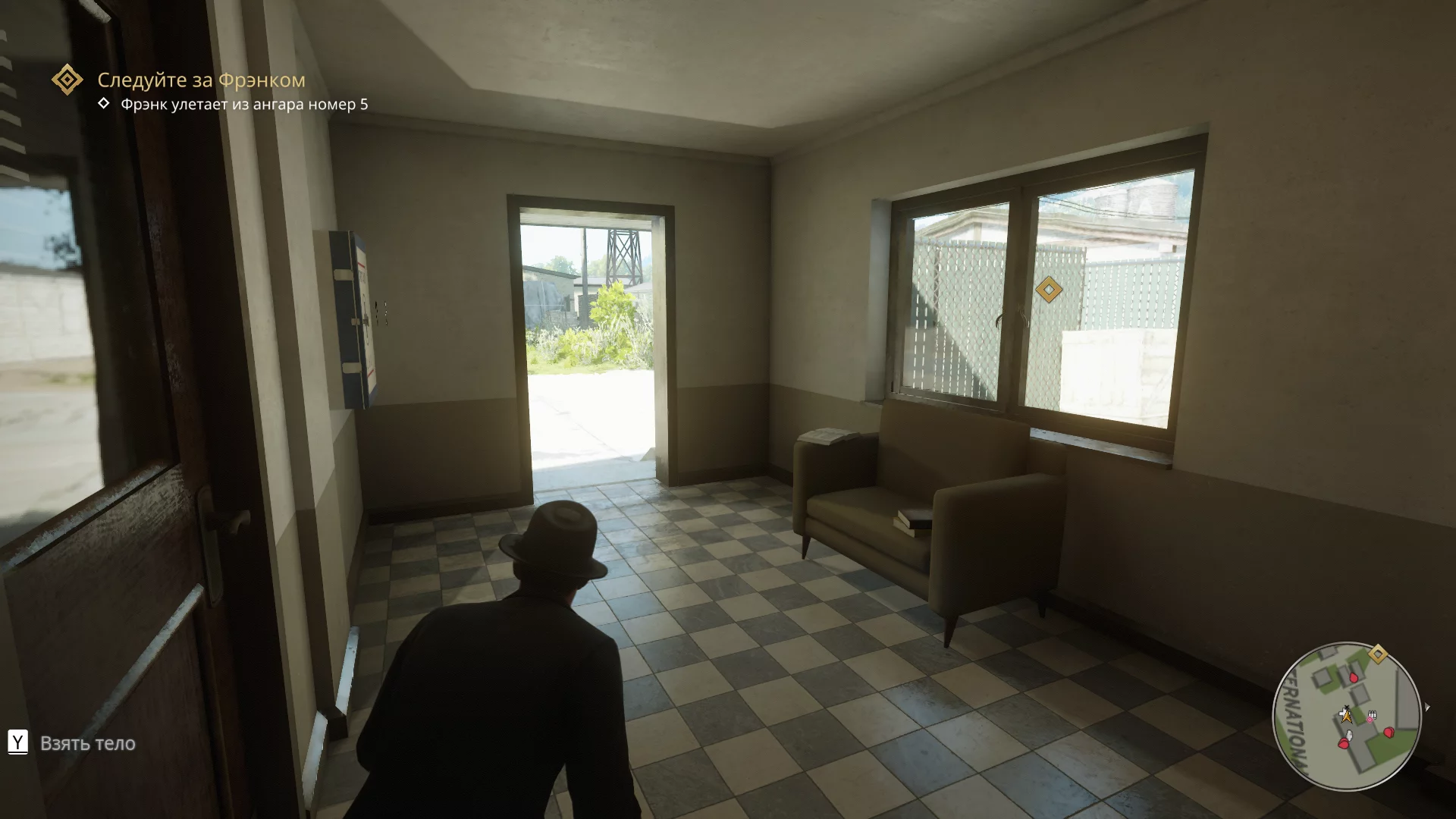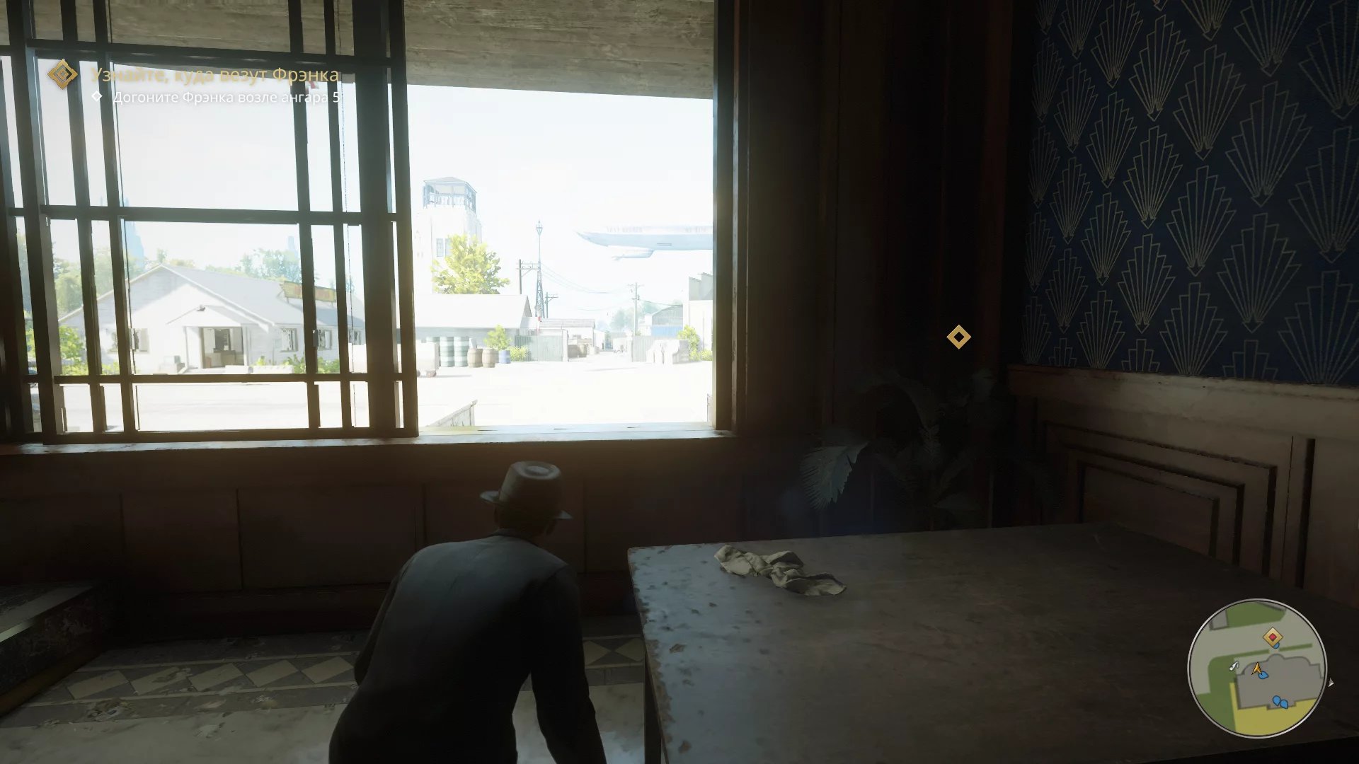 На столе читаем записку и узнаем про 5 ангар. Проходим за спиной агента и выбираемся в открытое окно. Ждем пока уедет зеленая машина и уйдут оставшиеся агенты. Идем в сторону ангара.