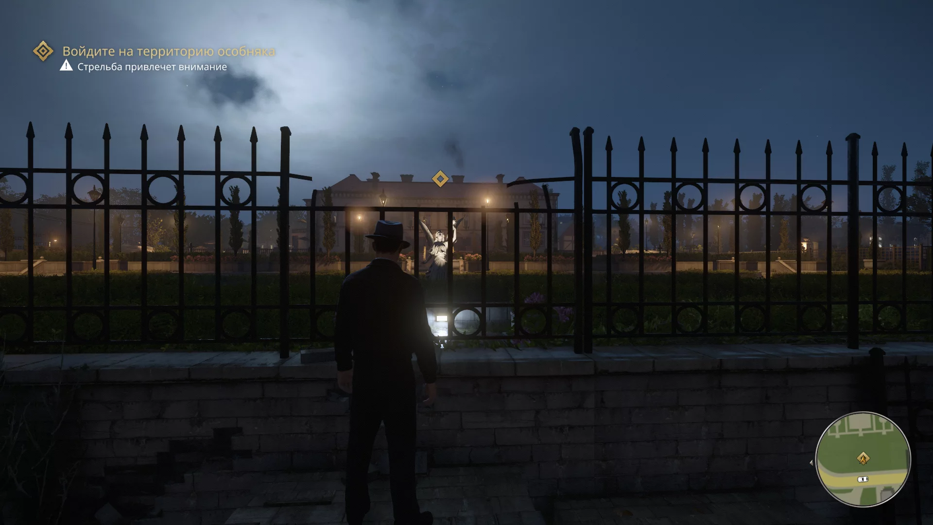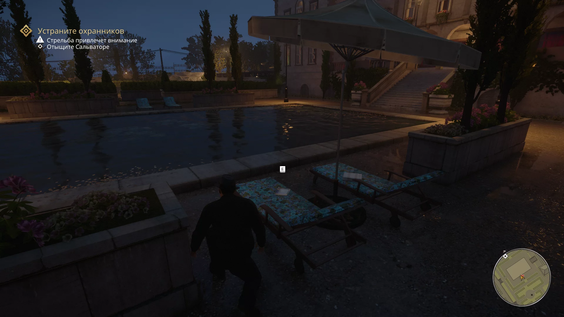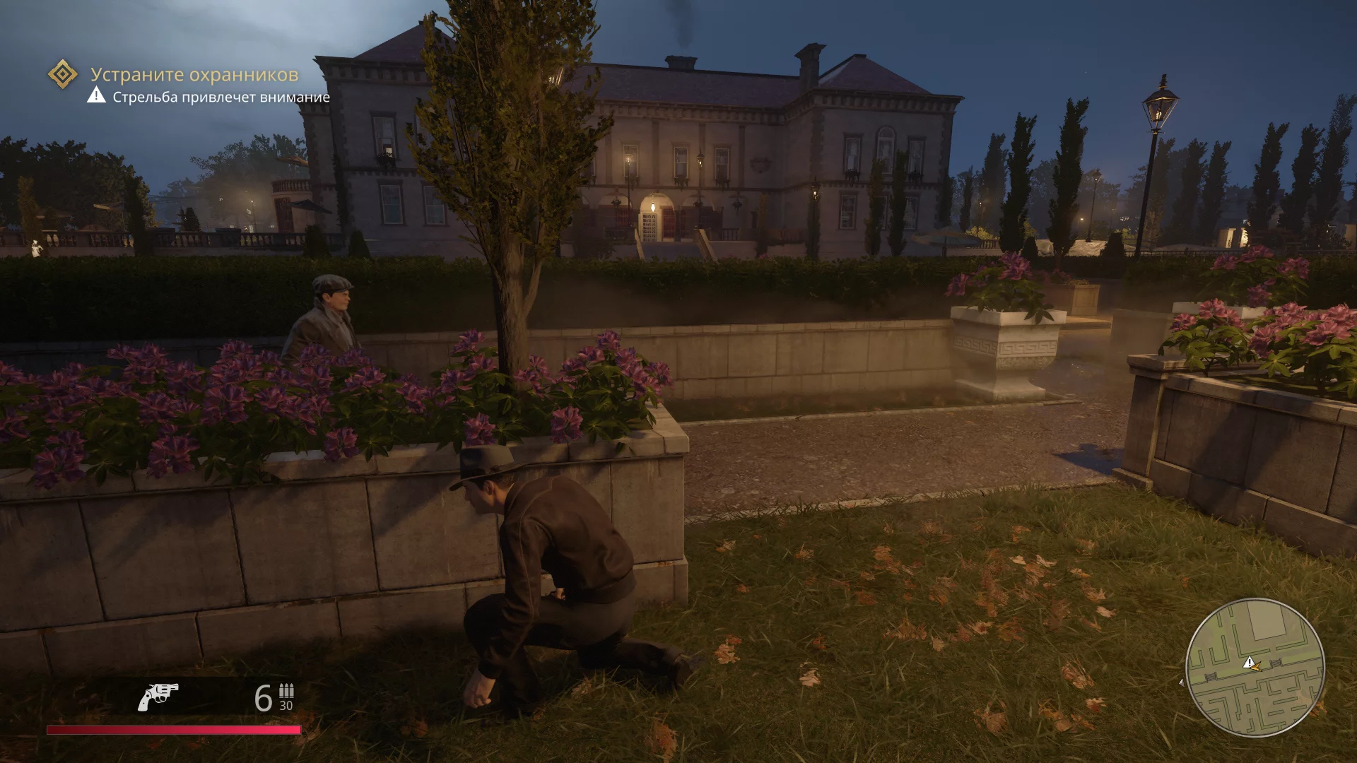 Едем к дому прокурора. Перелазим через забор и скрытно устраняем охранников в саду-лабиринте. В нижней части будет три охранника. Поднимаемся выше, но лучше не прятаться за клумбами, там вас могут заметить.