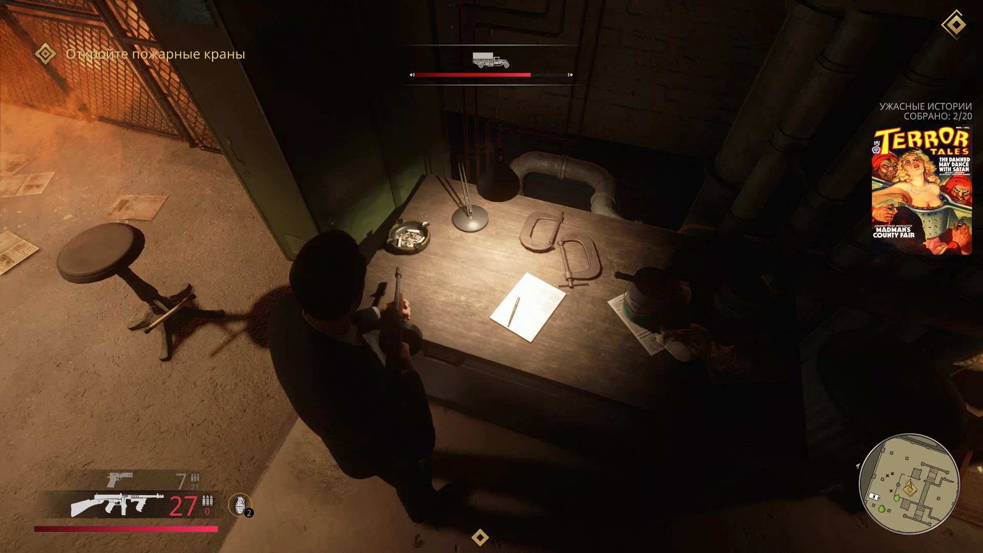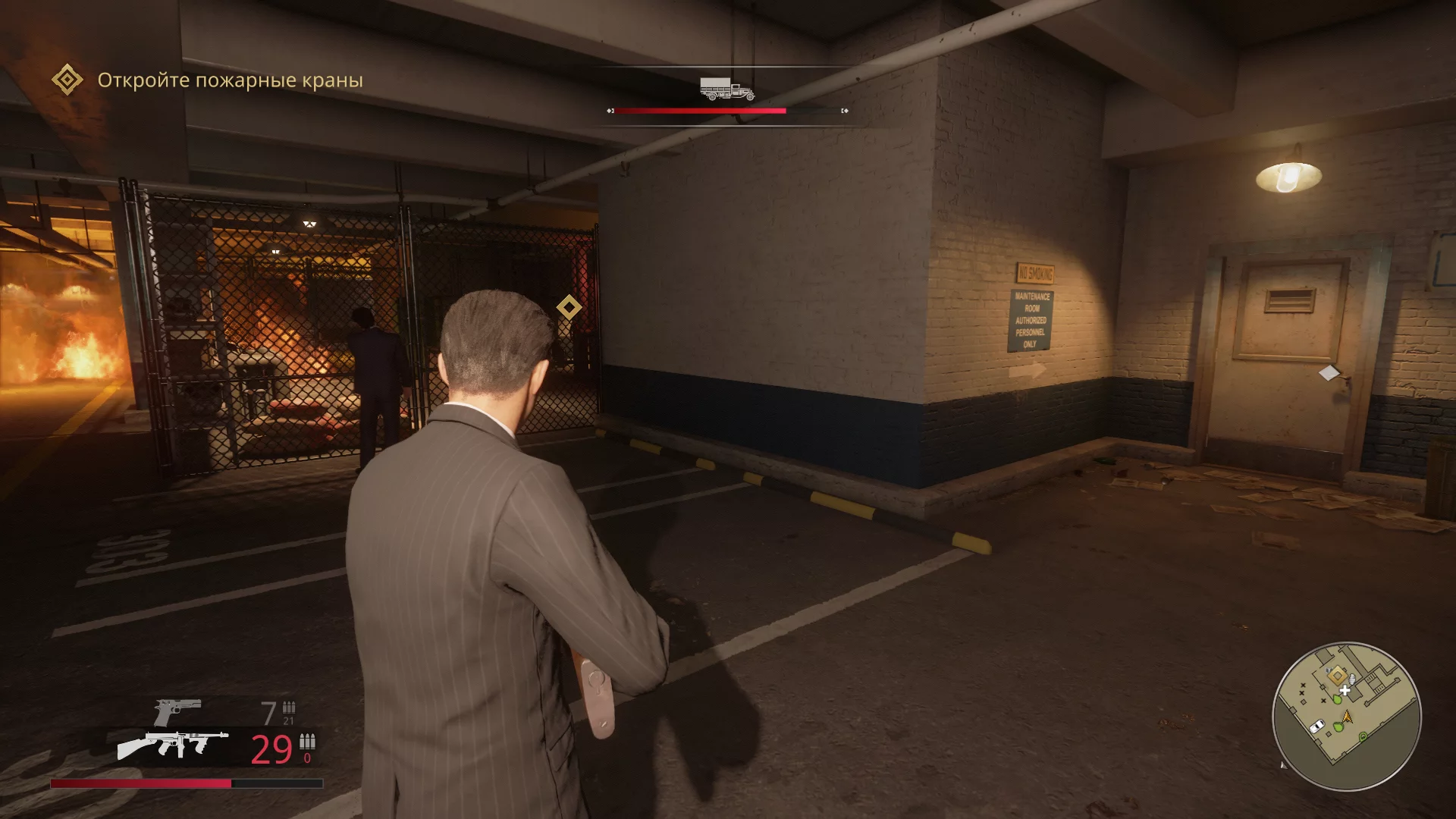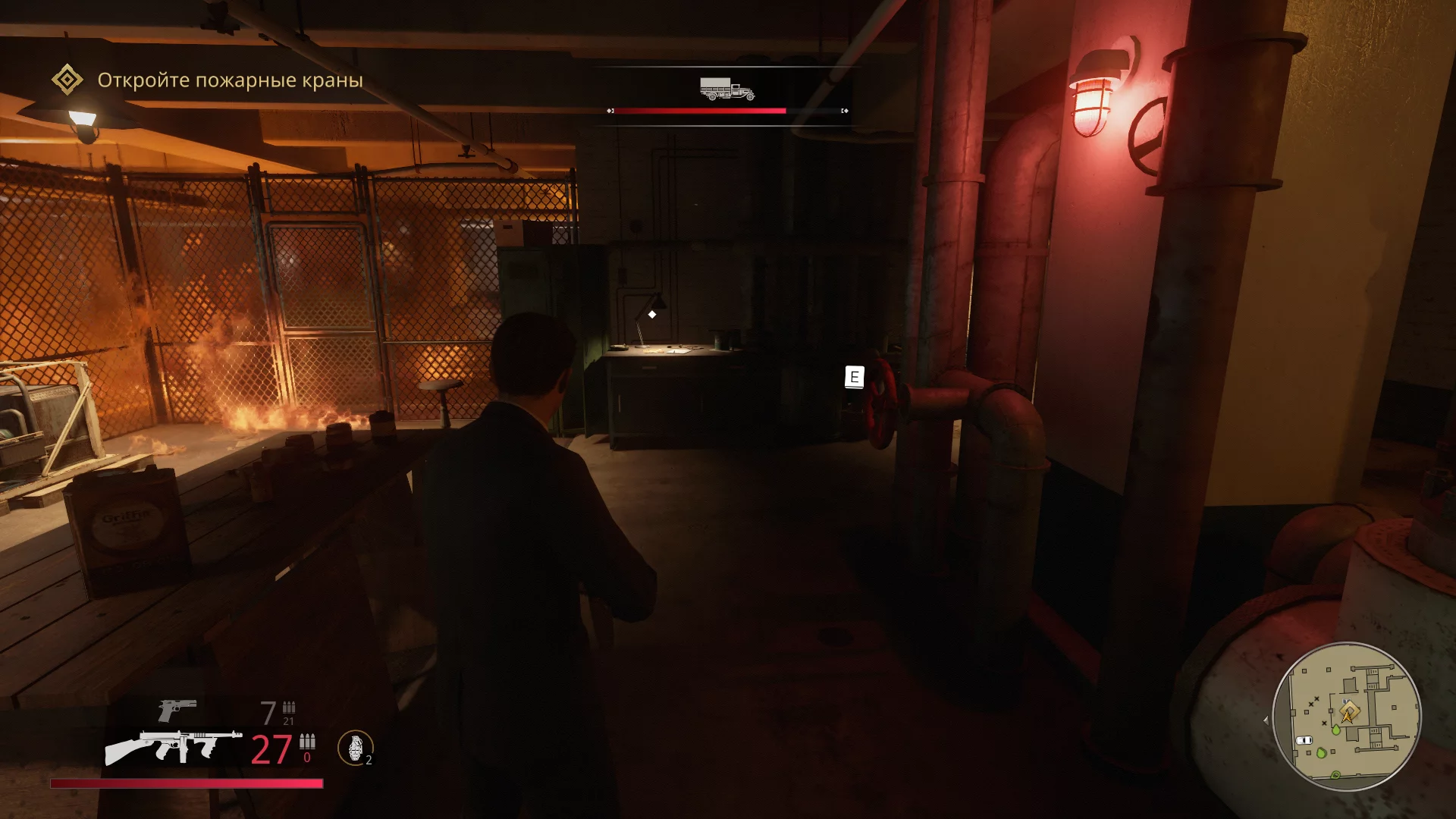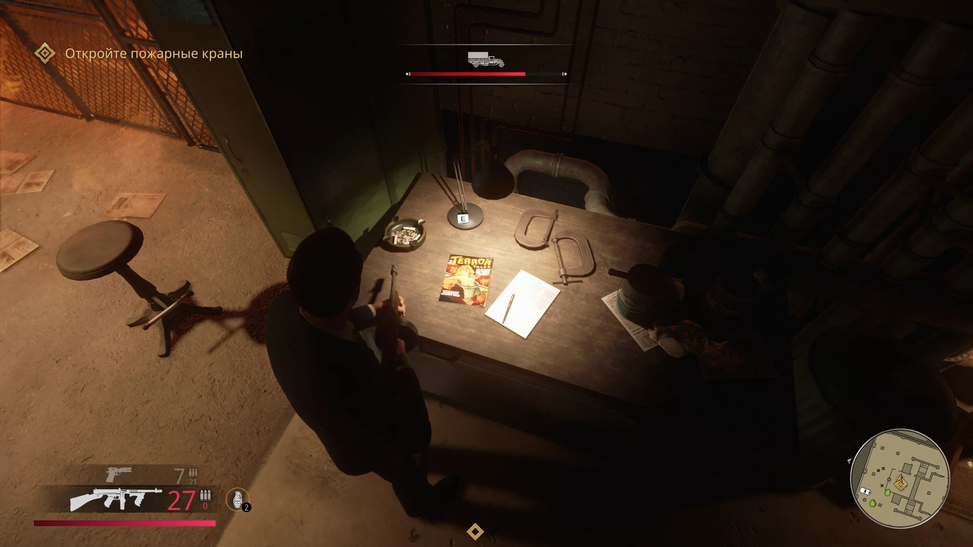 На этаже с пожаром придется обойти через дверь, чтобы включить подачу воды и избавиться от огня. На столе можно взять журнал. Спускаемся на первый этаж и берем машину. Едем за грузовиком. Активно стреляем по противникам, не подпускаем их близко к грузовику. Возвращаемся на склад и отмечаем.