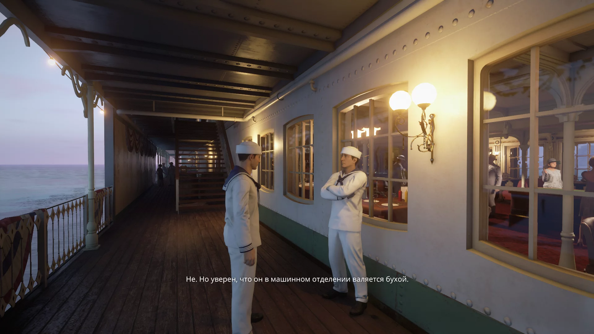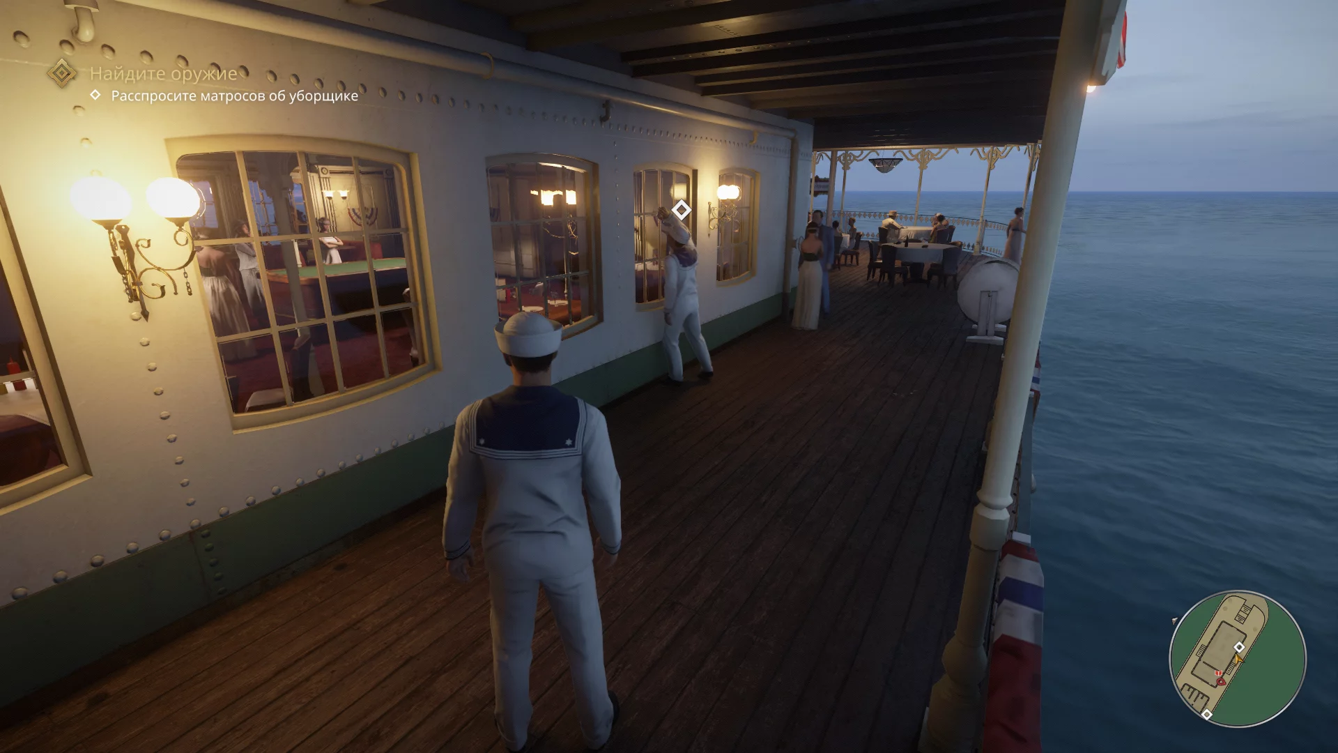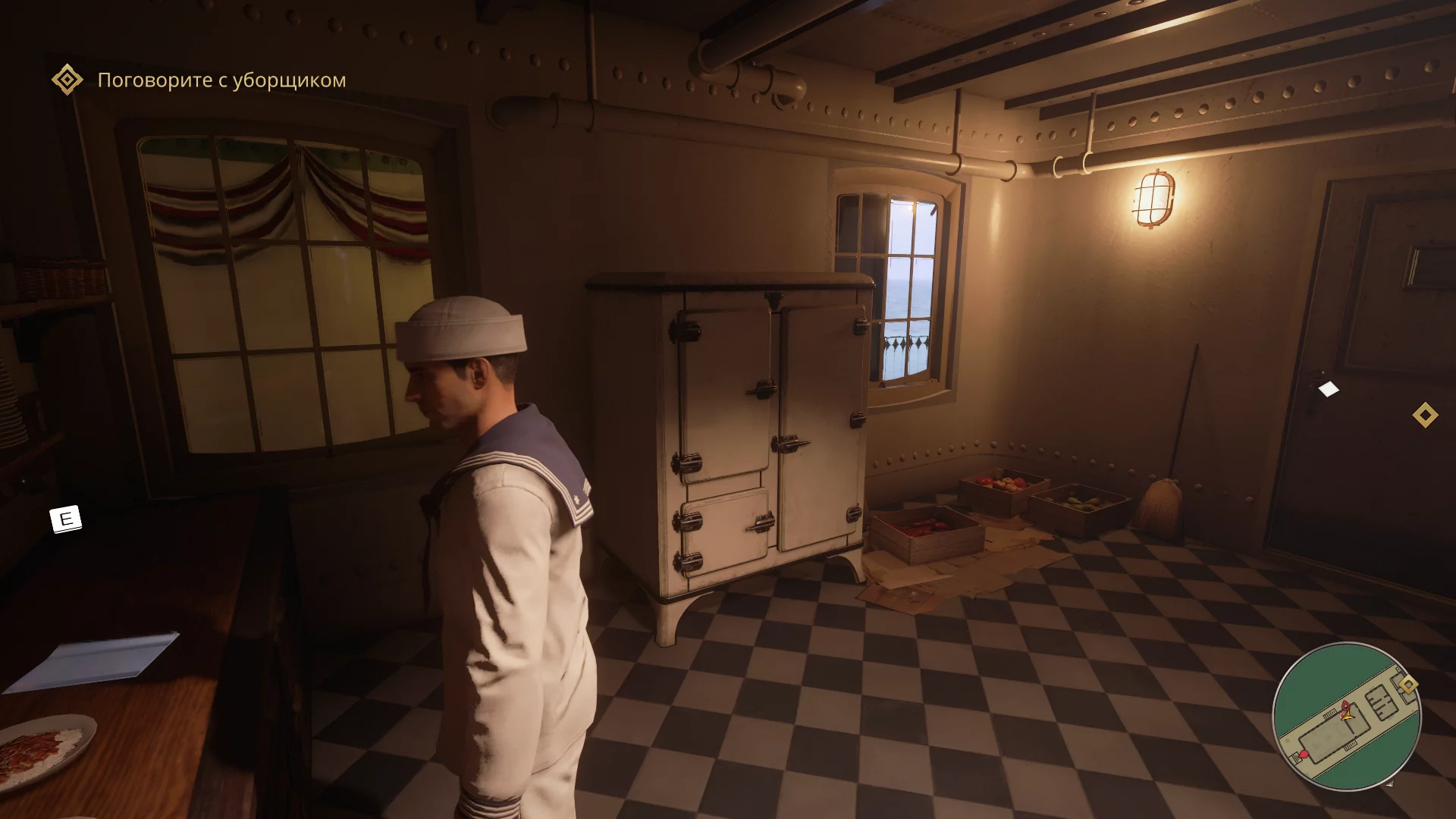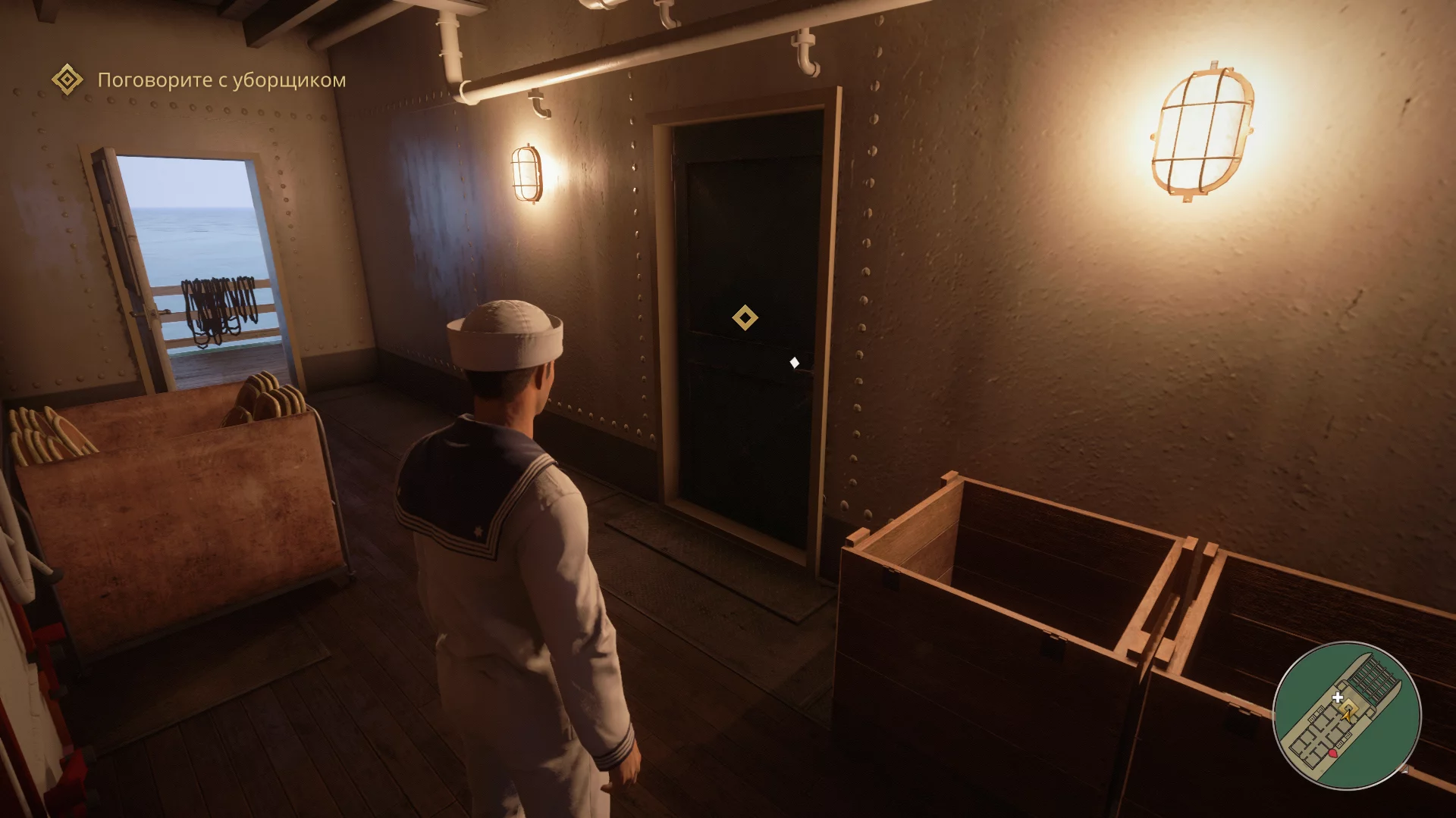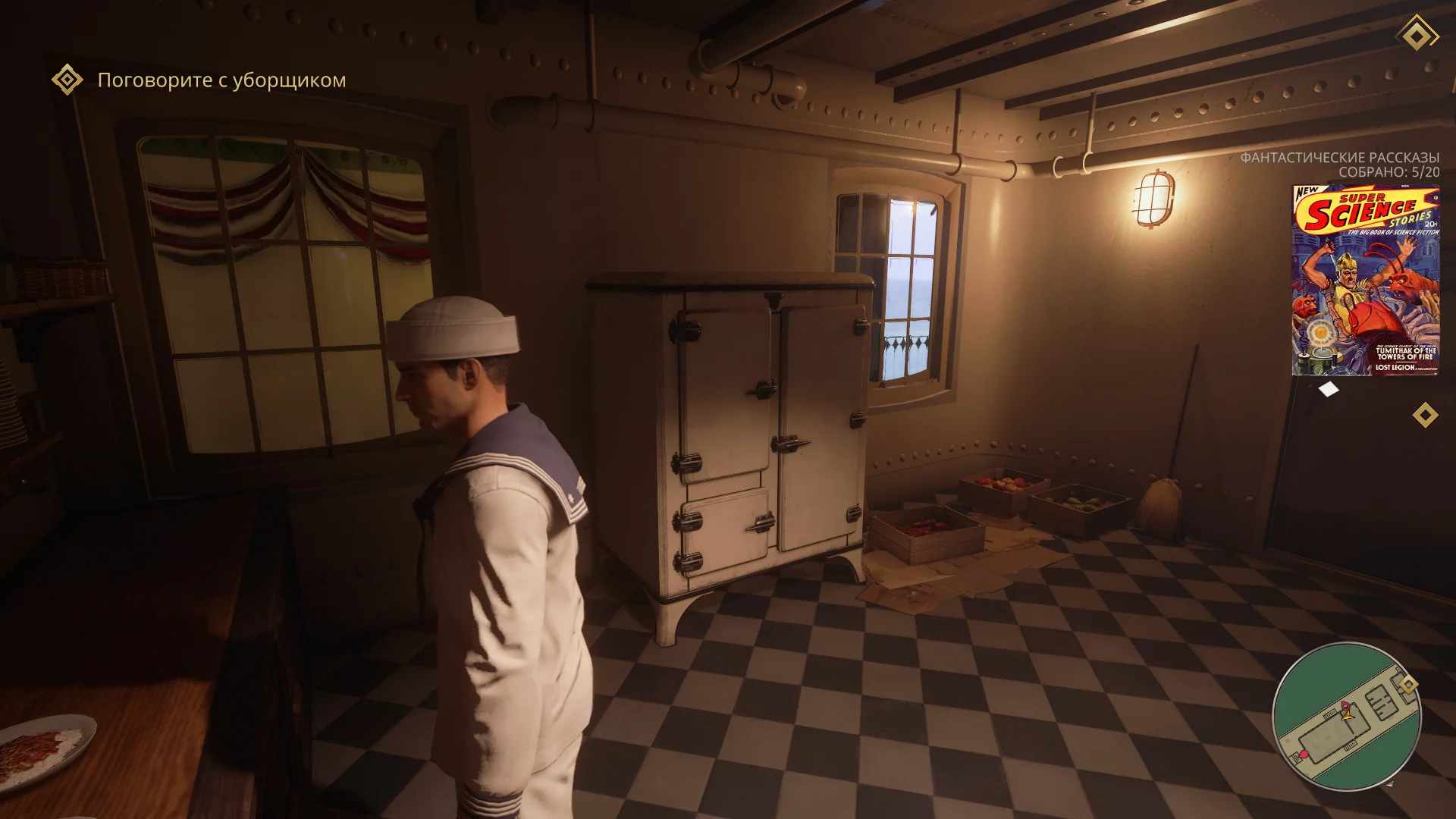 Здесь нам нужно найти гальюн (туалет), где спрятан пистолет. Спускаемся вниз и говорим с матросами. Заходим на кухню и берем журнал с рассказом. Спускаемся еще ниже и говорим с уборщиком.