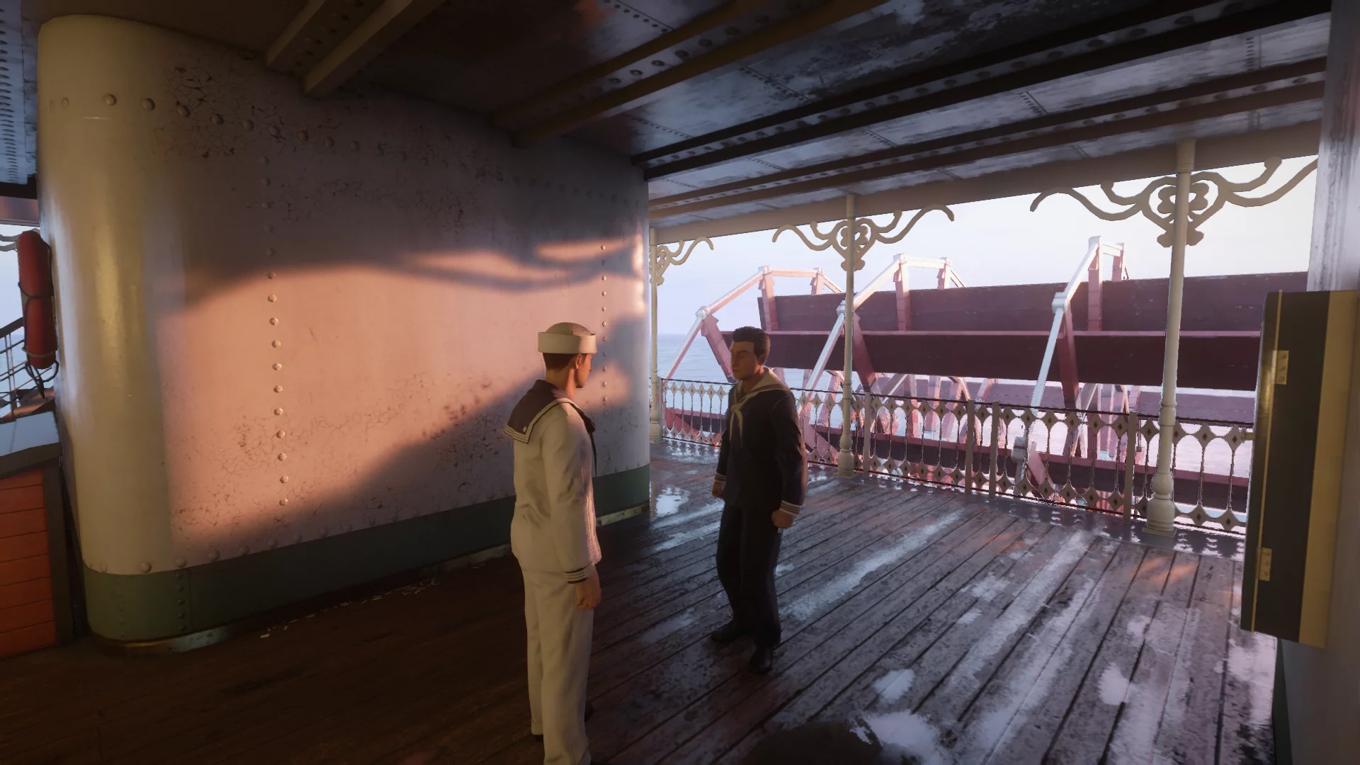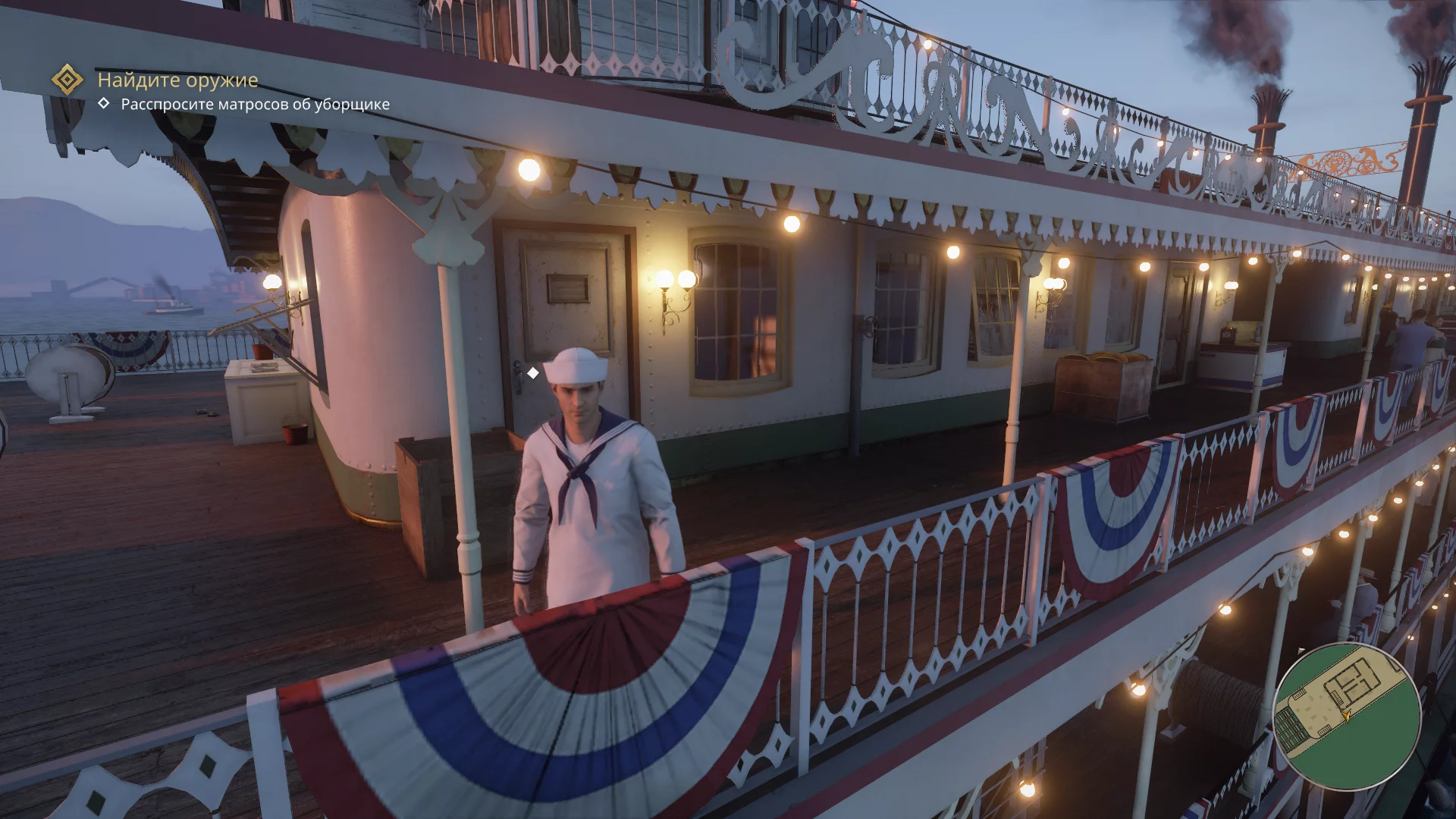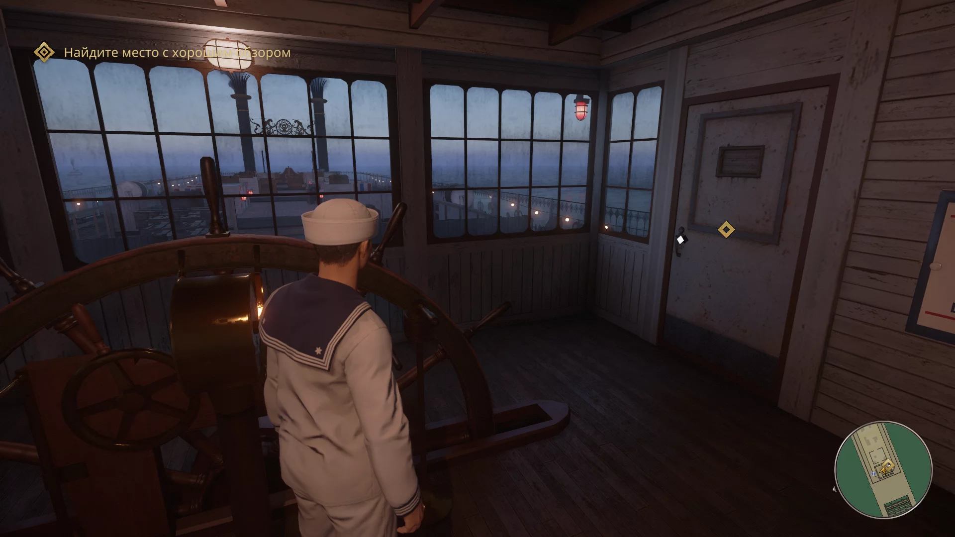 Заходим в здание за Сэмом и на столе берем сигаретный вкладыш. Заходим в кабинку и переодеваемся в матроса. Поднимаемся на борт.