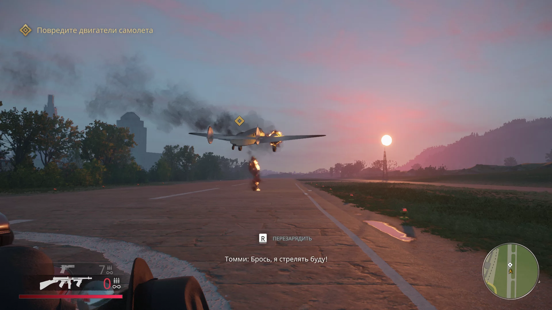 Запрыгиваем в машину и едем за самолетом. Прицеливаемся и стреляем по двигателям. Преследуем поврежденный самолет, а затем едем на место падения.