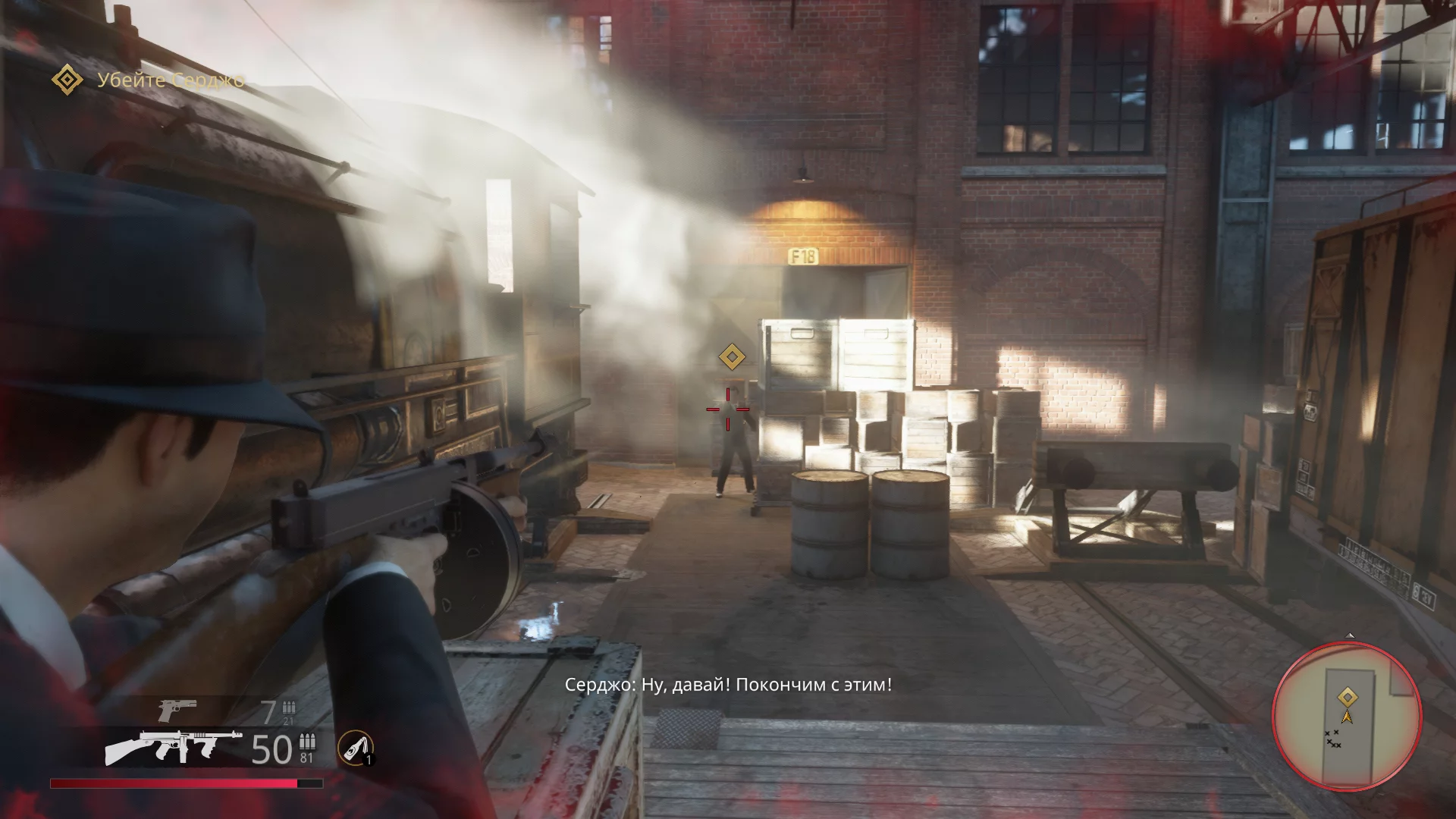Доезжаем до места, тут начнется перестрелка. Прорываемся к цели, по пути будет много противников. На кранах будут снайперы. В конце поднимаемся в будку стрелочника и тянем рычаг. Поезд проломит ворота склада, заходим туда. Добиваем оставшихся и Серджо.