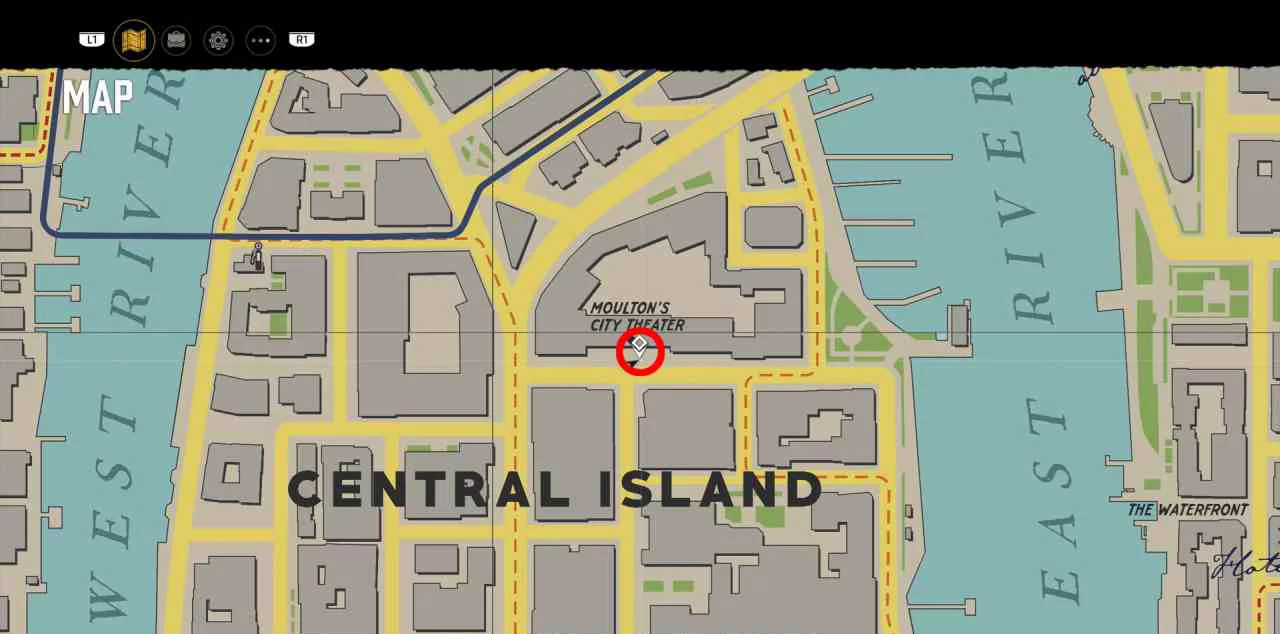 Центральный остров — под газетным киоском, к западу от городского театра Моултона.
