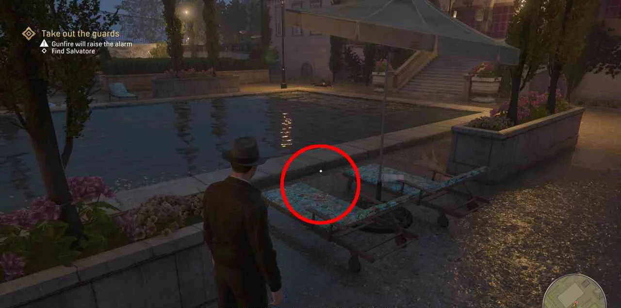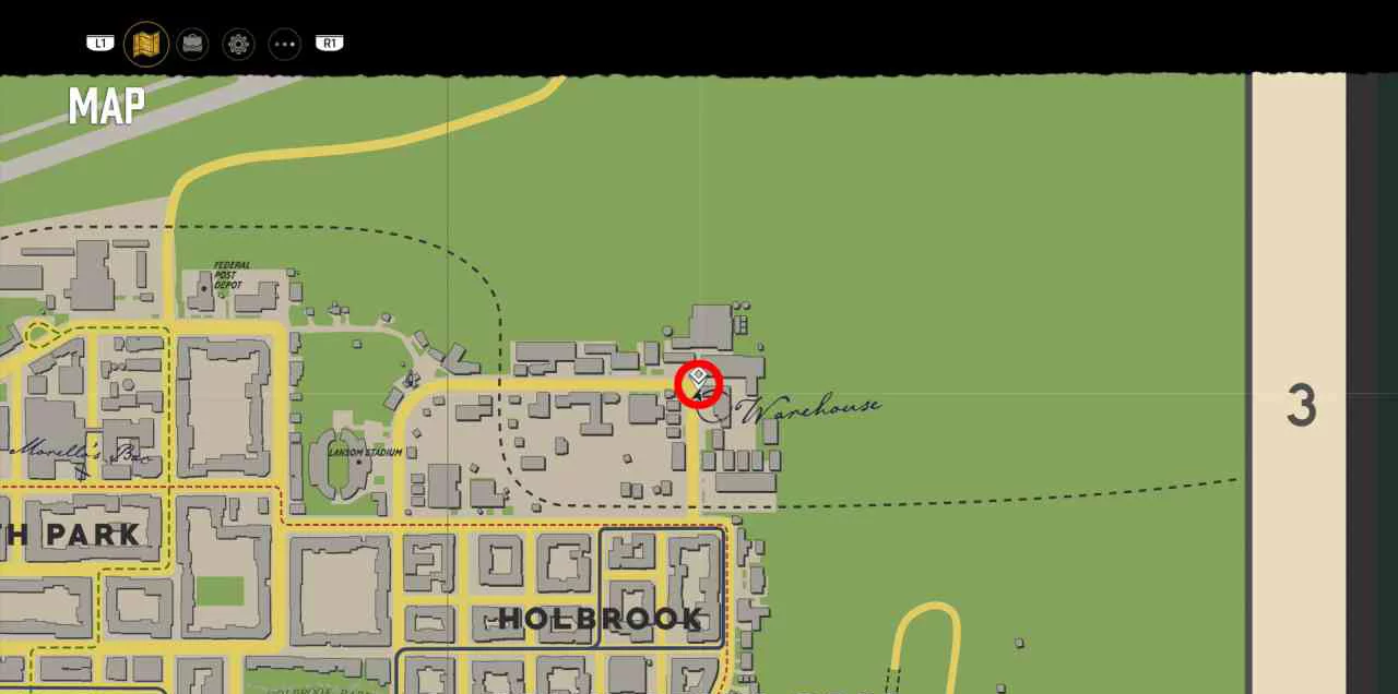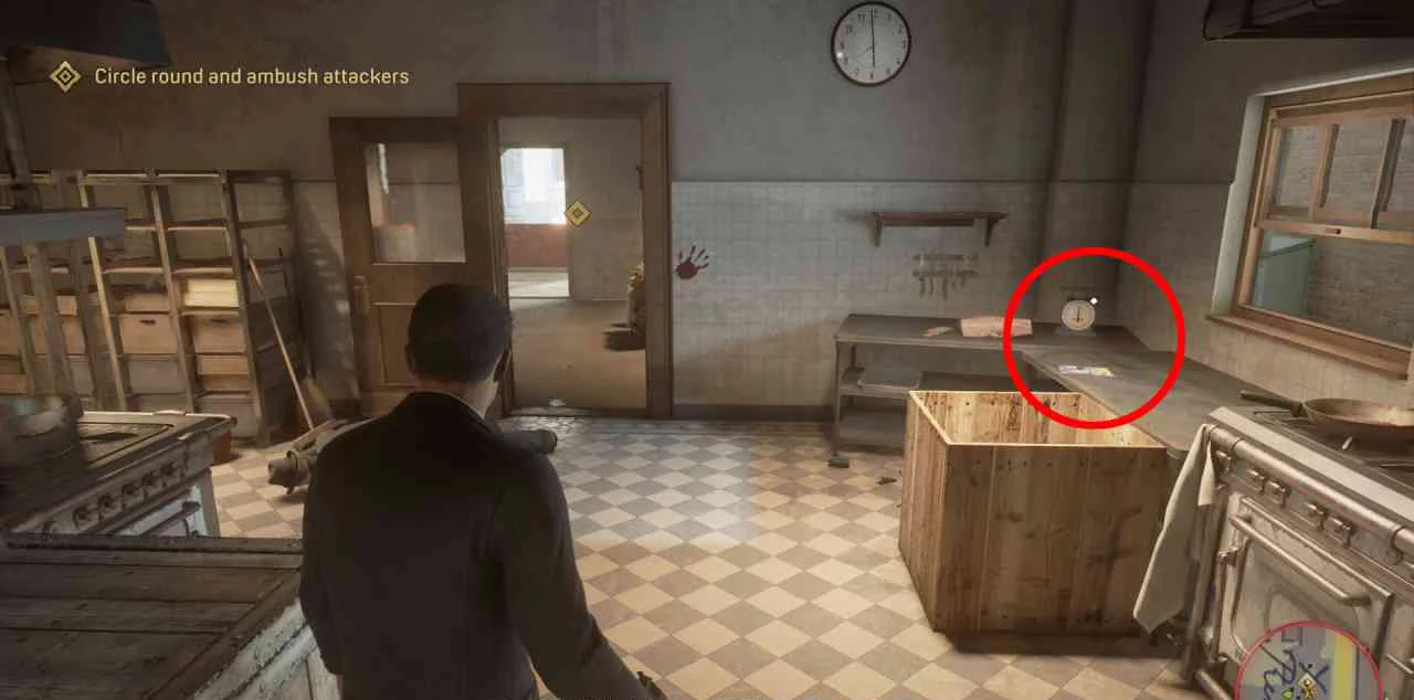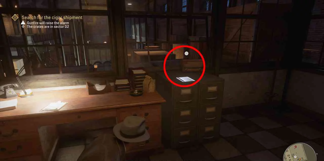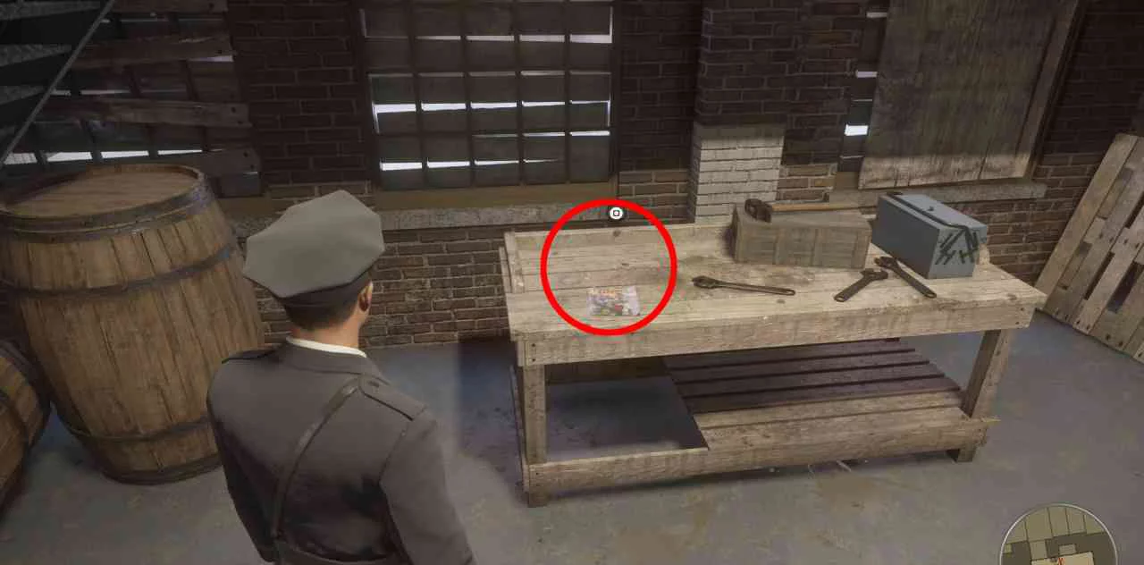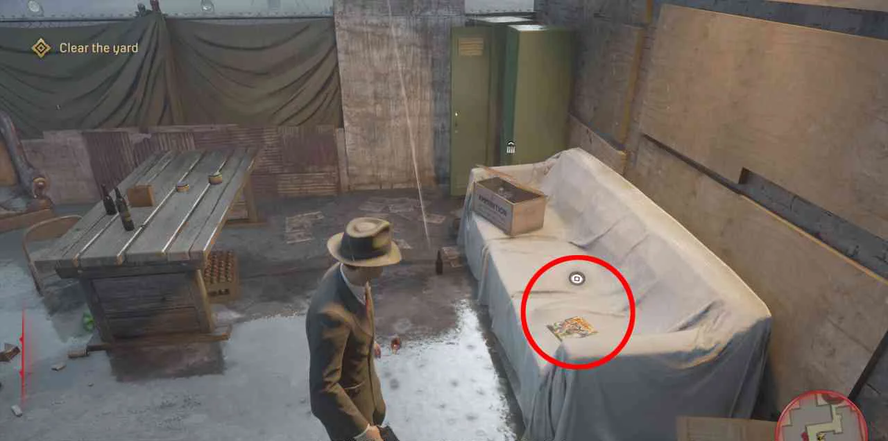 Глава 18: Чисто для разрядки — в большой комнате, где вы должны обыскать несколько ящиков (белые маркеры), с патрулирующими вооруженными противниками. Проверьте офис наверху.