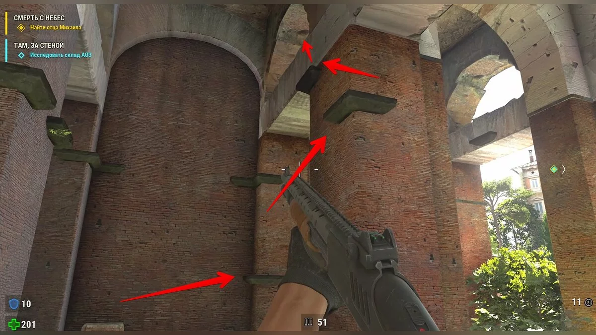 На стенах вы увидите небольшие выступы, по которым нужно прыгать. Секретное хранилище находится в арке под самым потолком. Используйте скриншот ниже, чтобы добраться до него.