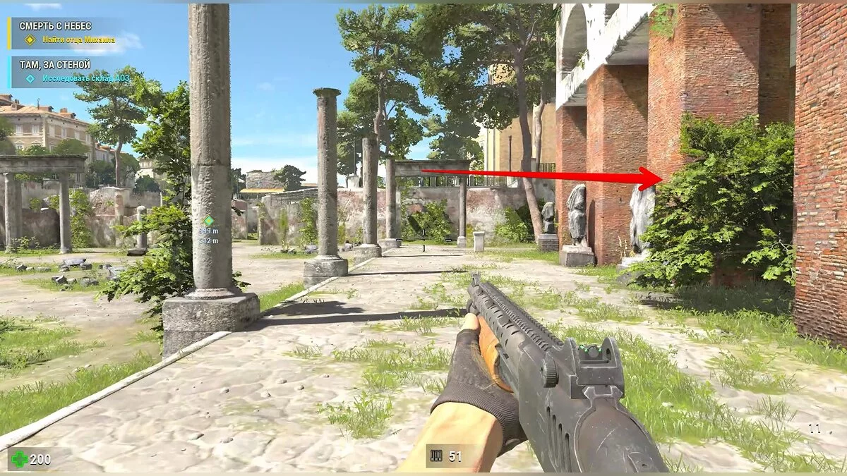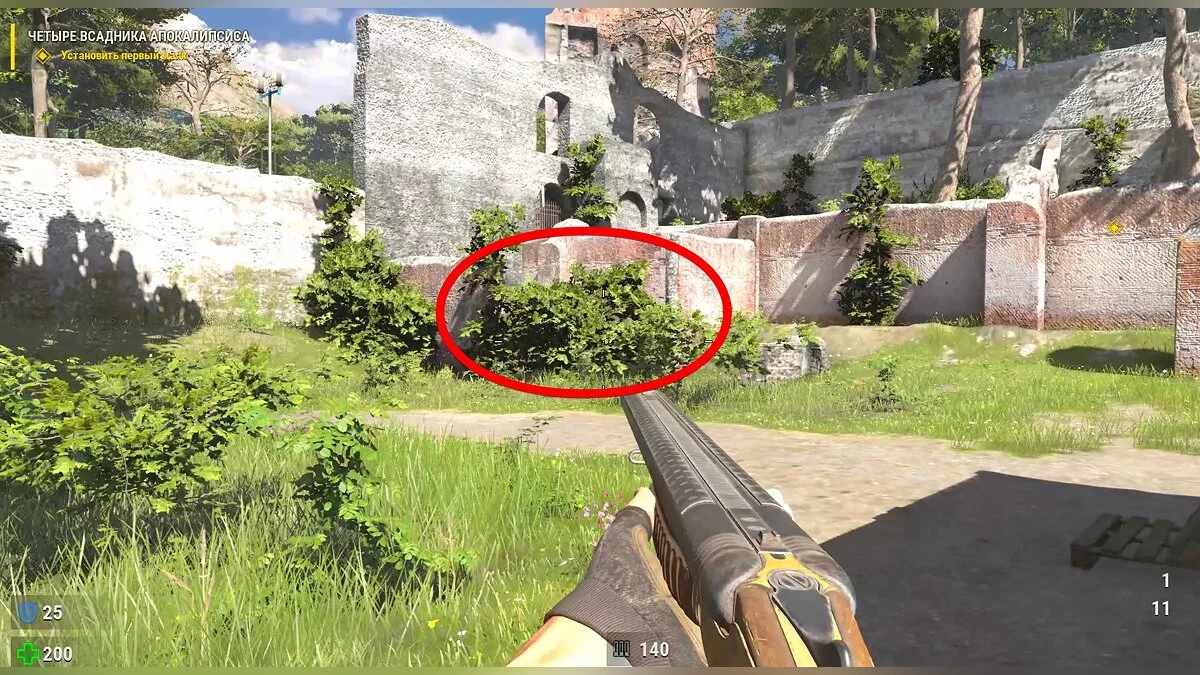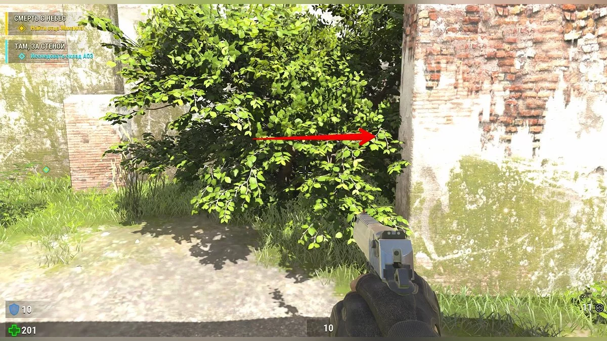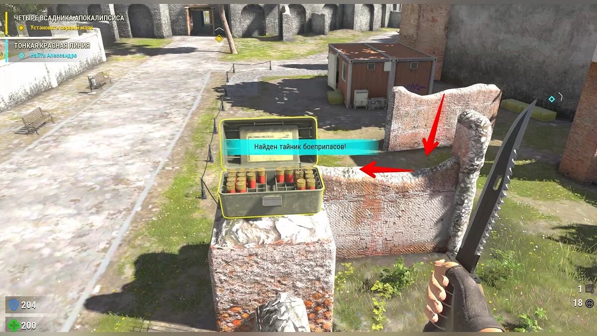 Тайник боеприпасов. Как только вы появитесь в новой главе, мы советуем хорошенько обыскать стартовую локацию. Первым делом направляйтесь в левую часть карты и осмотрите развалины за кустами. Здесь находится тайник боеприпасов.