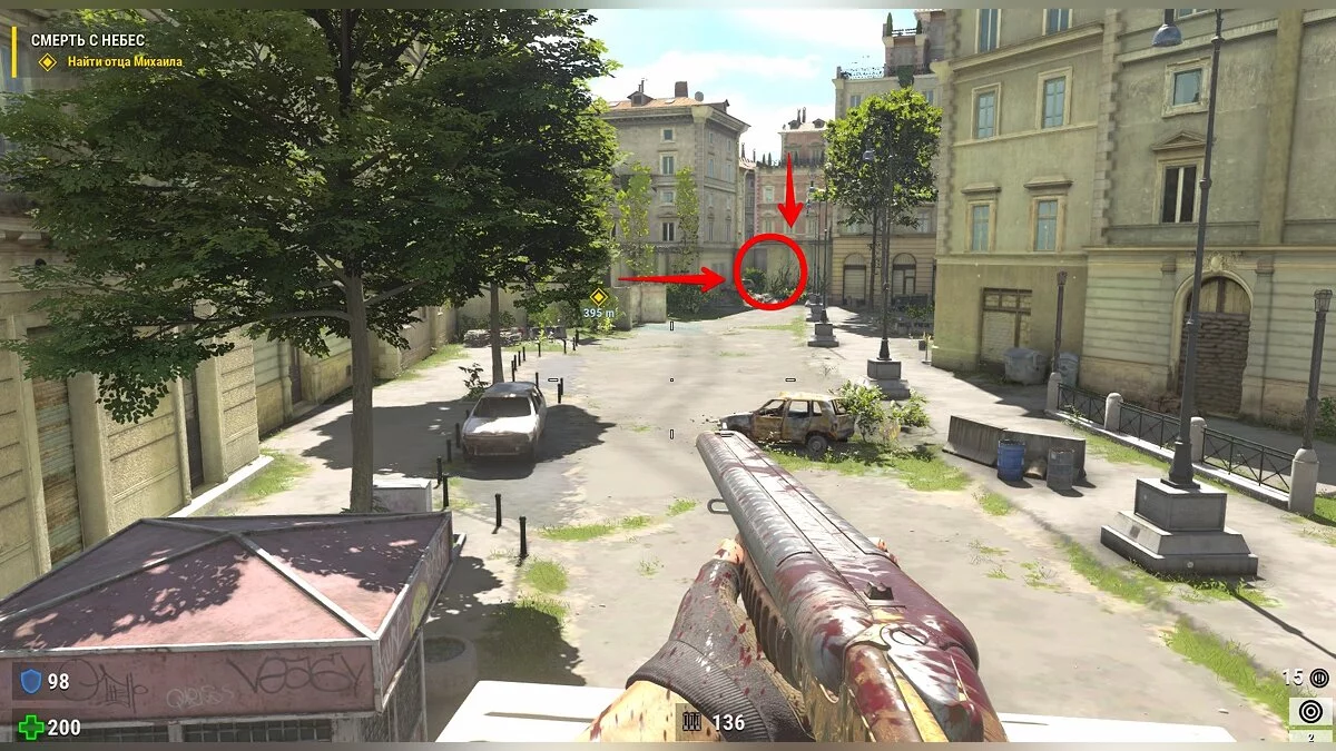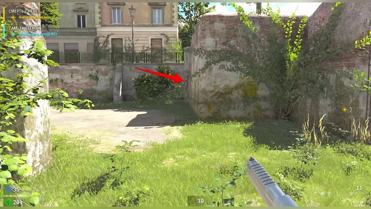 Тайное хранилище. Проход к следующему тайнику вы можете наблюдать прямо с кузова грузовика, когда подберете секретную броню. Вам нужно проследовать до конца улицы, затем повернуть направо и пройти через небольшие кусты. Здесь вы найдете несколько аптечек, броню и боеприпасы.