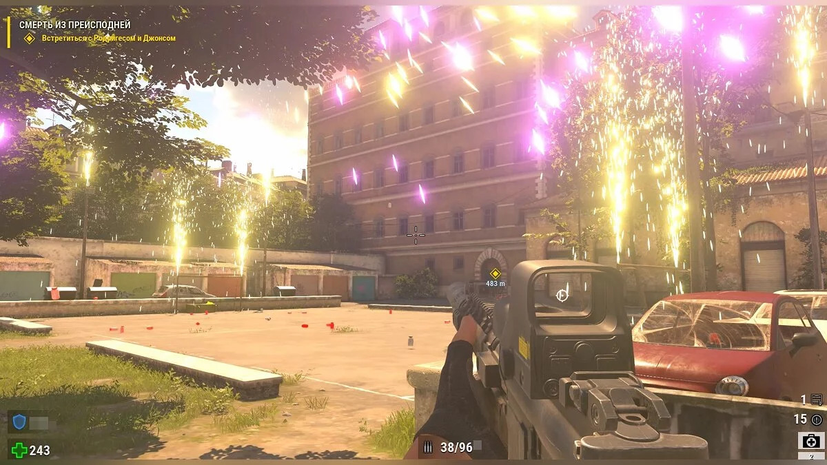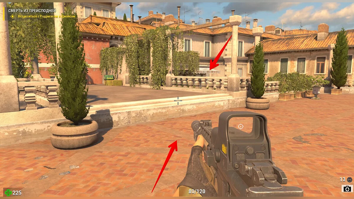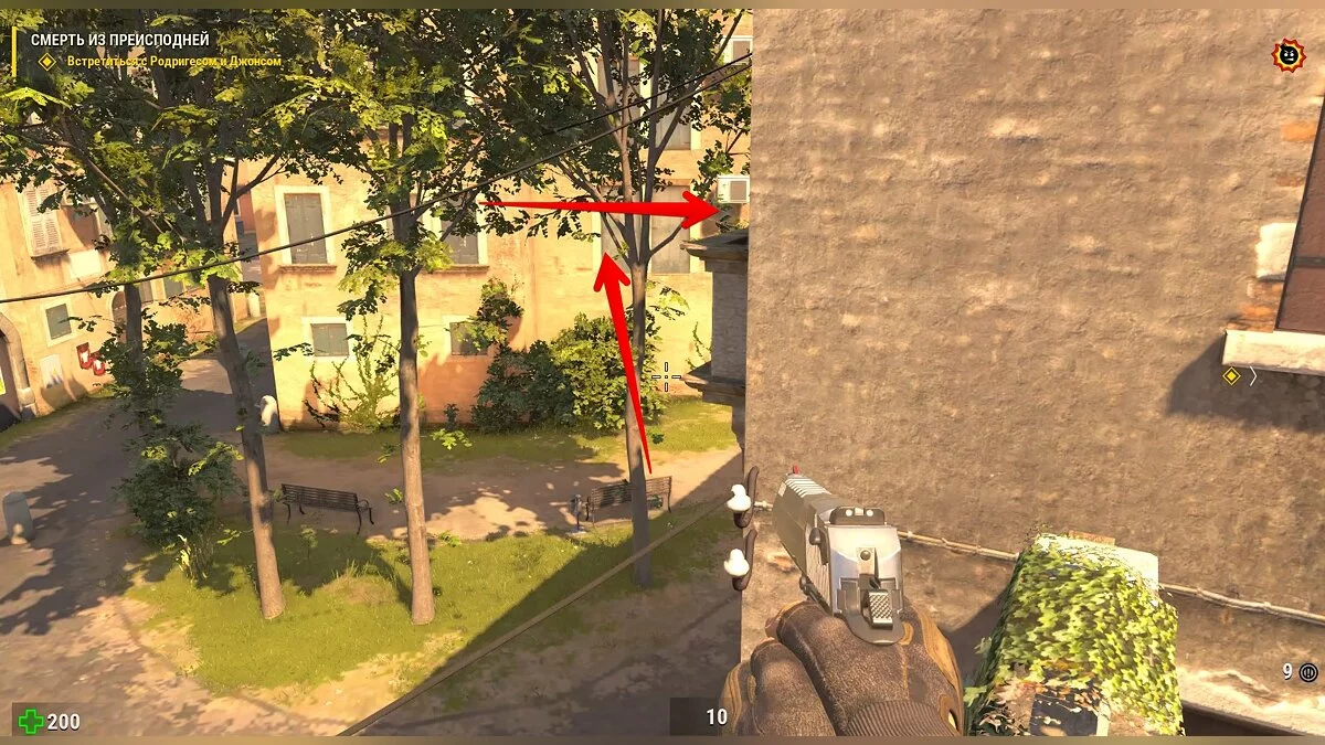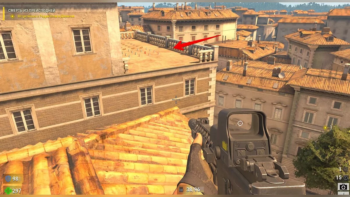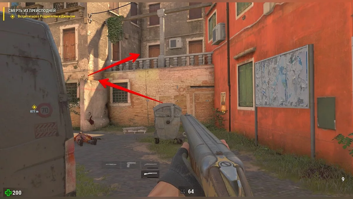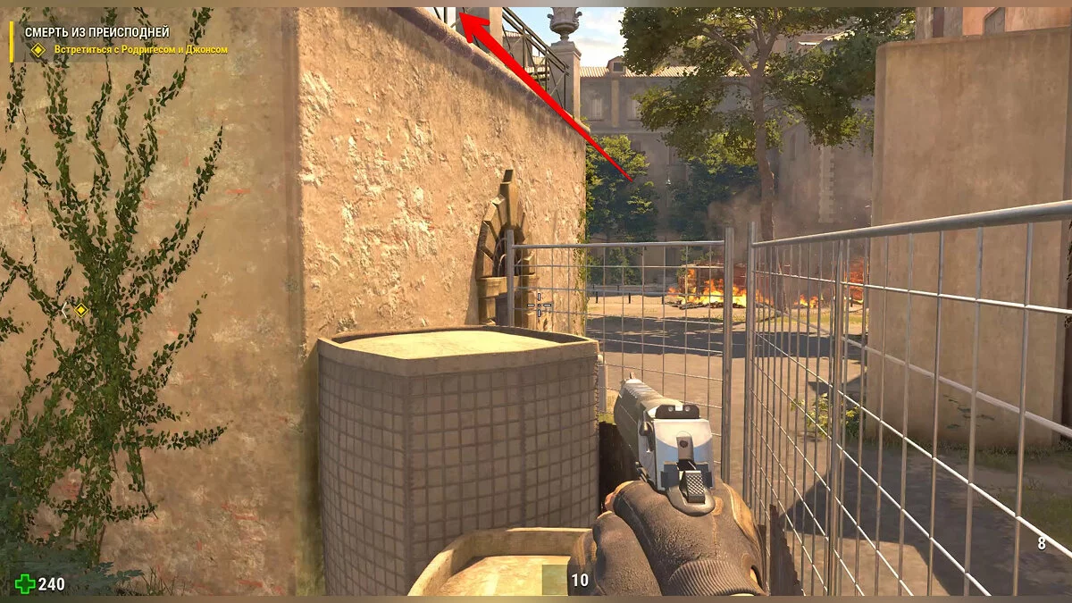 Тайник боеприпасов. Бегите к горящему грузовику и смотрите кат-сцену. После этого вам нужно проследовать в переулок, за которым находится большая группа солдат. Справа от них есть небольшой балкон. Прыгайте по мешкам, чтобы забраться на него и найти картечь и ракеты.