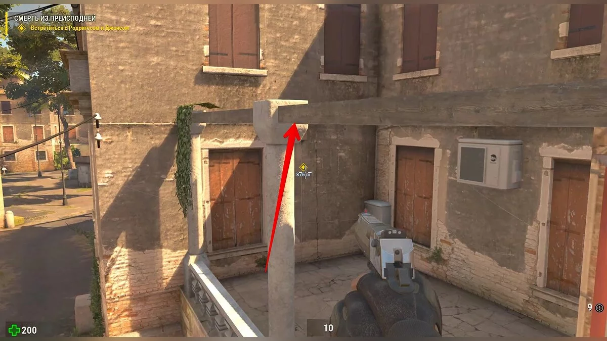 Теперь начинается самое веселье. Вам нужно добраться до бетонной балки, которая завершает балкон наверху. Сделать это можно двумя способами.