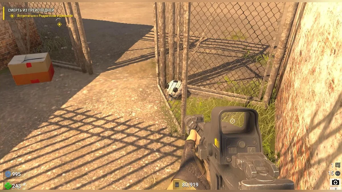 Вам нужно любыми способами подкатить его к воротам и «забить гол». Стоит отметить, что Сэм может толкать мяч ногами, но при этом круглый катится слишком медленно. С другой стороны, если вы будете стрелять по мячу из оружия, он станет катиться слишком быстро. Выберите для себя оптимальный вариант.