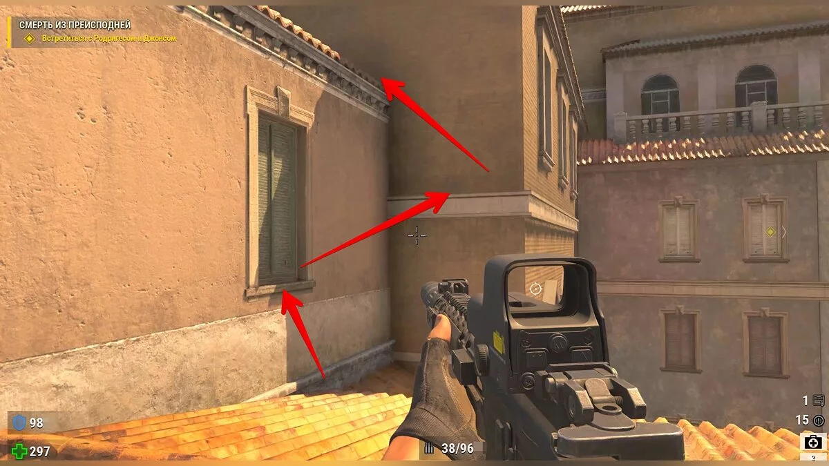 Тайное хранилище. Последнее тайное хранилище расположено в довольно неочевидном месте. Попав на крышу, разберитесь с врагами и сверните налево. Перед длинным проходом еще раз повернитесь и посмотрите на окно слева. Вам нужно запрыгнуть на подоконник, с него на парапет, затем на крышу.
