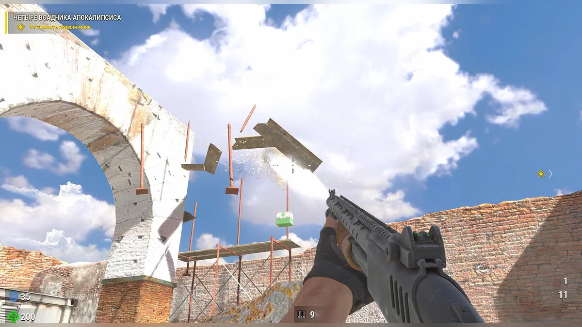 Секретная аптечка. Когда вы найдете ключ от запертых ворот в вагончике в левой части локации, выходите наружу, обернитесь и посмотрите наверх. Справа от колонны на лесах есть аптечка. Мы долго думали, как можно к ней добраться, пока просто не начали стрелять по доскам, на которых она лежит.