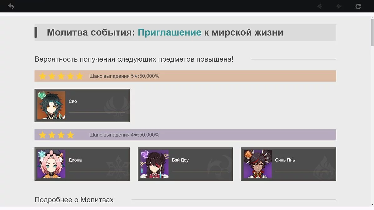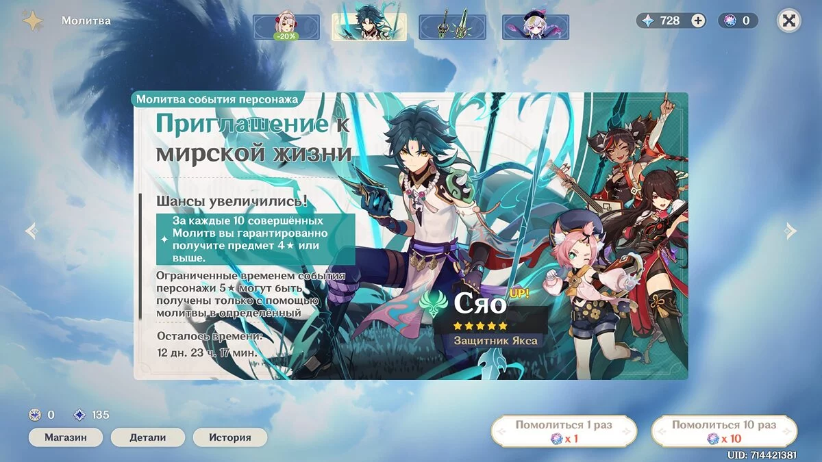 До 17 февраля Сяо доступен в Молитве «Приглашение к мирской жизни». К нему присоединились три четырёхзвёздных персонажа, которые уже были в игре: Диона, Бэй Доу и Синь Янь. Этот баннер будет доступен до 17 февраля, когда его заменит «Танец фонарей», в котором Кецин является главным персонажем.